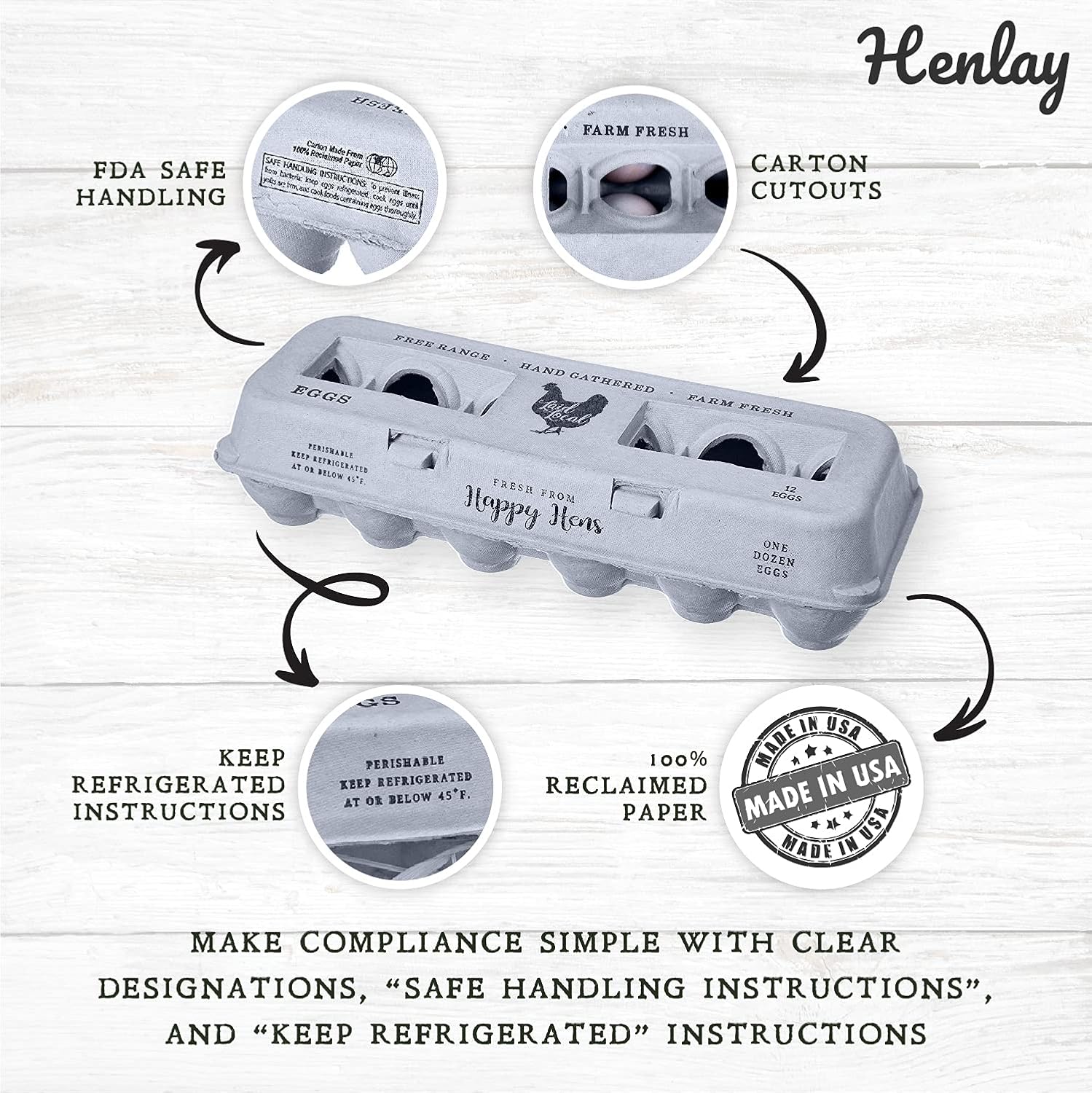 - Henlay cartons are designed to make FDA compliance simple, including required safe handling instructions The top has a flat blank area to optionally stamp or label the name of your farm or coop and return instructions