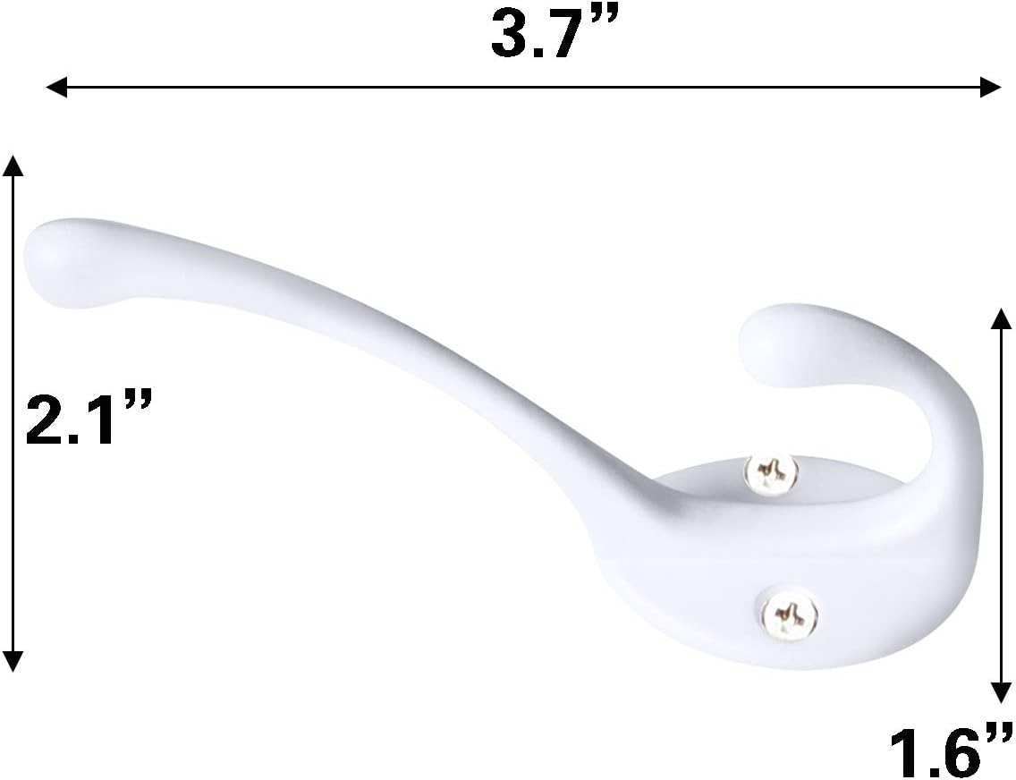 - High Quality Material:These heavy duty dual prong hooks are made of good quality zinc die cast material, the screws are made of iron, no rust, it can easily hold up to 35 lbs of weight. Hard and sturdy, can widely support coat, scarf, umbrella, bag, towel, key, hat, cup as well as Christmas socks and Christmas wreath