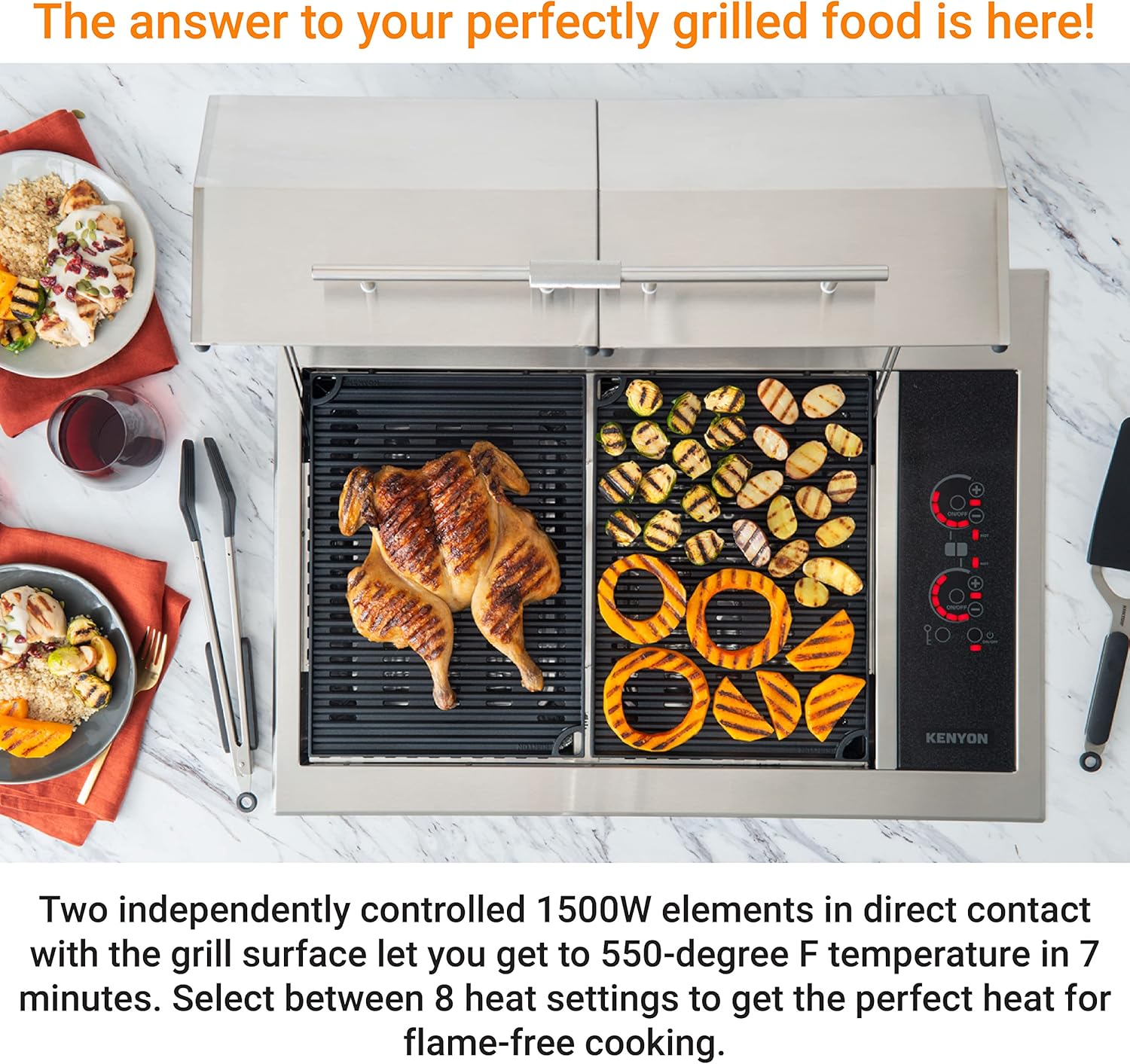- Quick Heat-Up: The grill has two independently controlled 1500W elements in direct contact with the cooking surface letting you get to 550-degree F temperature in 7 minutes. Select between 8 heat settings to get the perfect heat for flame-free cooking.
