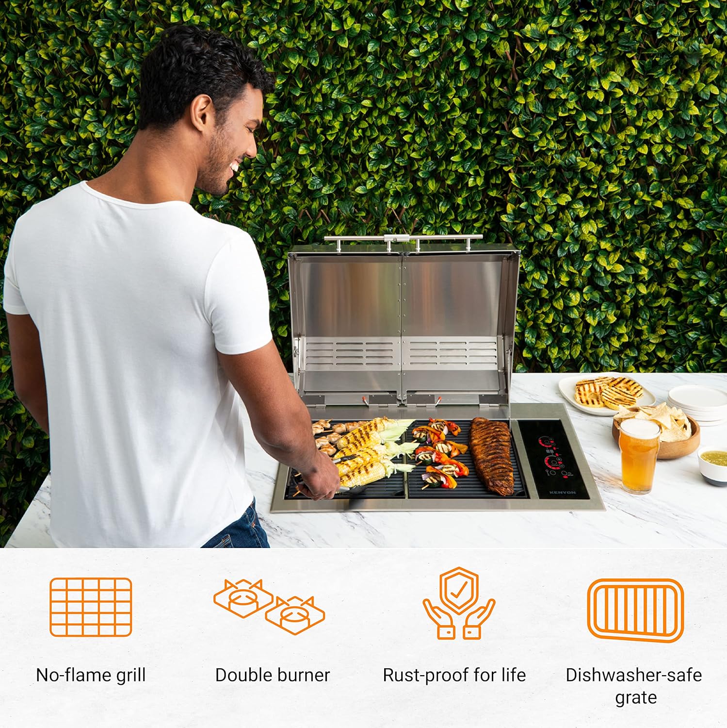 - Built-In Electric Grill: Kenyon B70405WH Texan Built-In electric grill has a smooth mounting flange for stone countertops. With 310 sq. inches of cooking area, the grill is suitable for outdoor kitchens where gas or charcoal grill options are not viable.