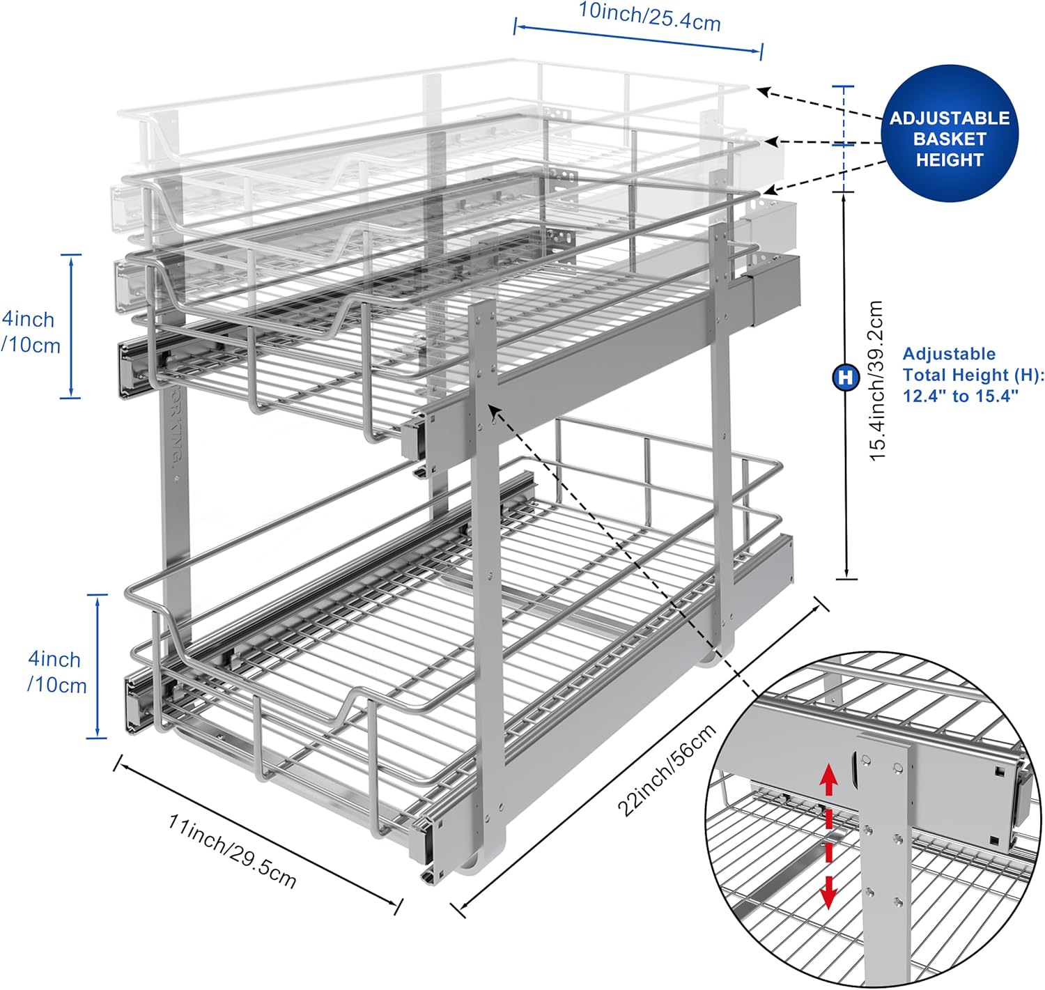 2 Tier Pull Out Cabinet Organizer 11" W X 22" D, Slide Out Drawers For Kitchen Cabinets, Pull Out Drawers For Cabinets Capacity Heavy Duty Caddy, Cabinet Pullout Shelves Chrome-Plated, Bathroom Pantry