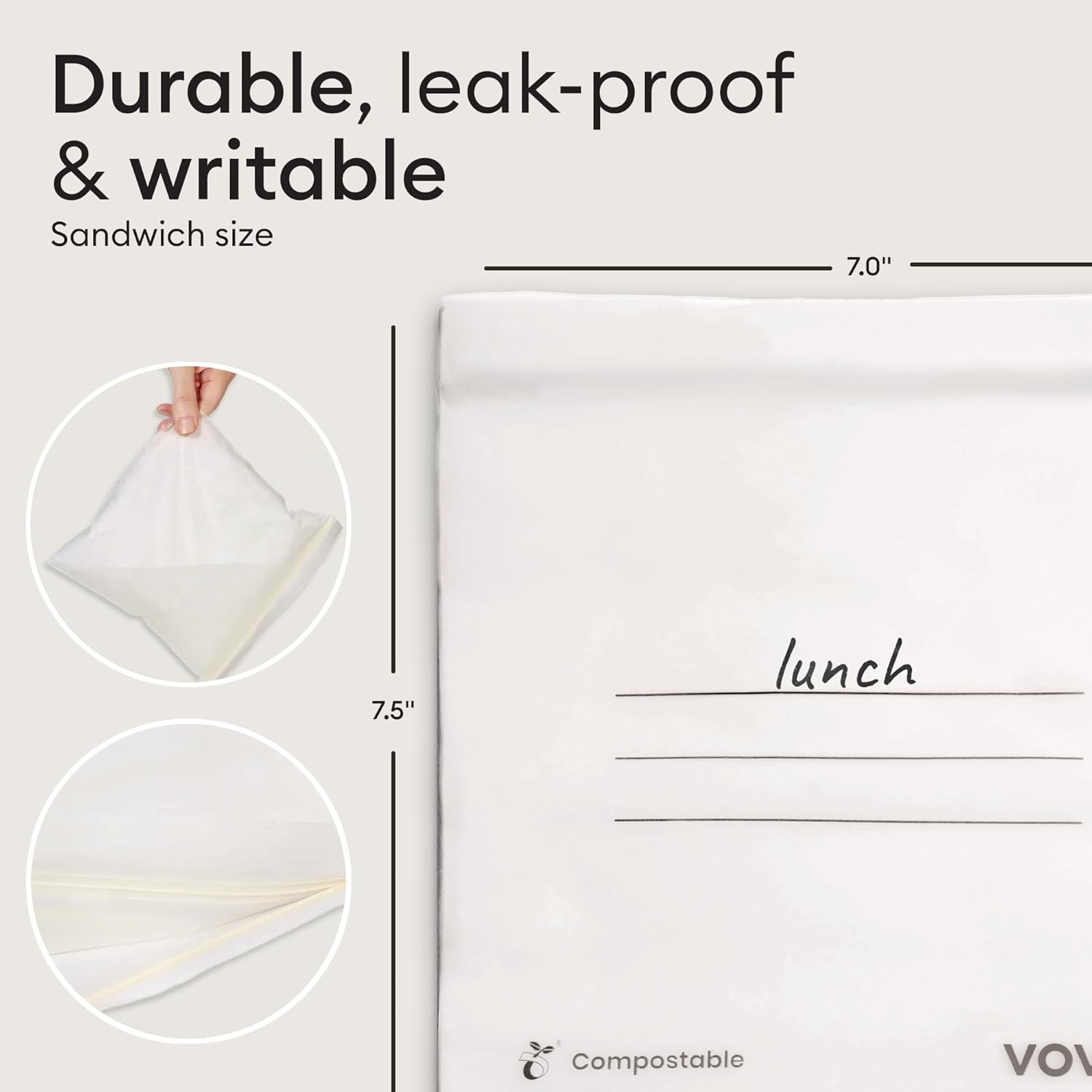 Vove Compostable Sandwich Bags, Medium 30 Count – Freezer Safe, Leak Proof, Non Toxic, Writable Surface for School Lunches & Meal Prep, Eco-Friendly