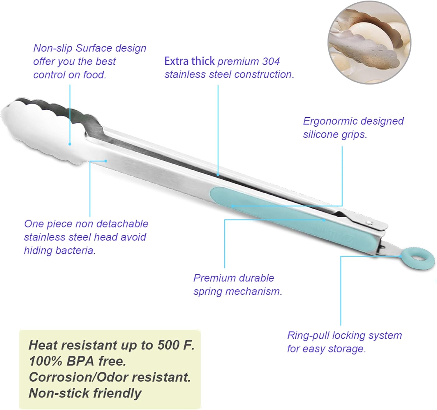 304 Stainless Steel Kitchen Cooking Tongs, 12" and 14" Set of 2 Sturdy Grilling Barbeque Brushed Locking Food Tongs with Ergonomic Grip, Aqua Sky