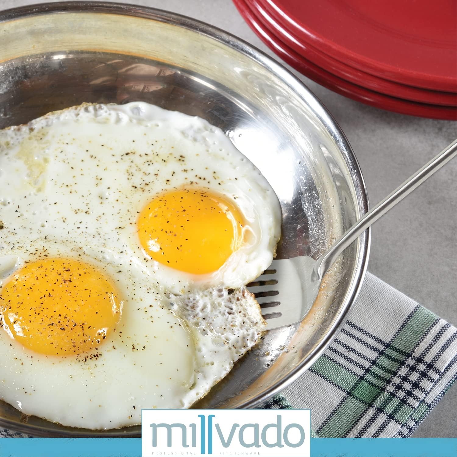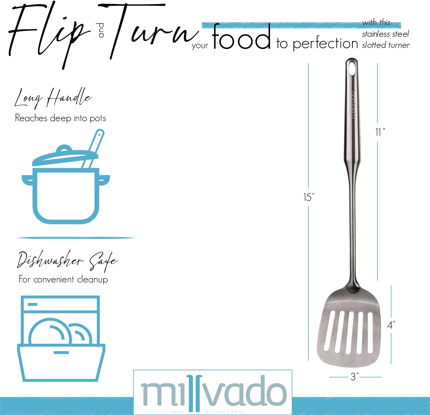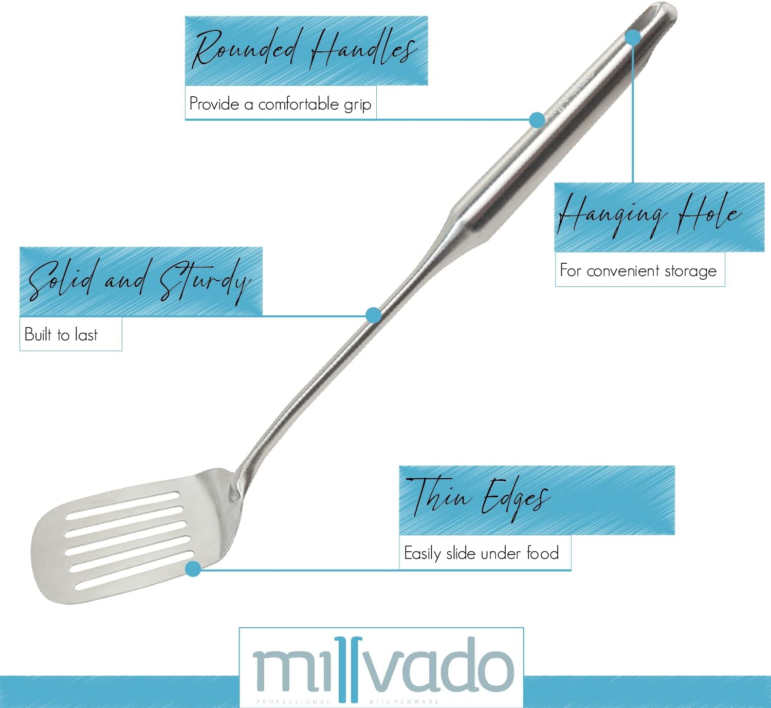 - THIN, YET STURDY: This stainless-steel spatula has a thin enough edge to easily slide under pancakes, omelets, or the like, yet it’s sturdy and will provide long-lasting durability. It has an ergonomic rounded handle, too, which won't cut into your hand while using. It's one of those spatulas you'll be glad you added to your kitchen tools collection!