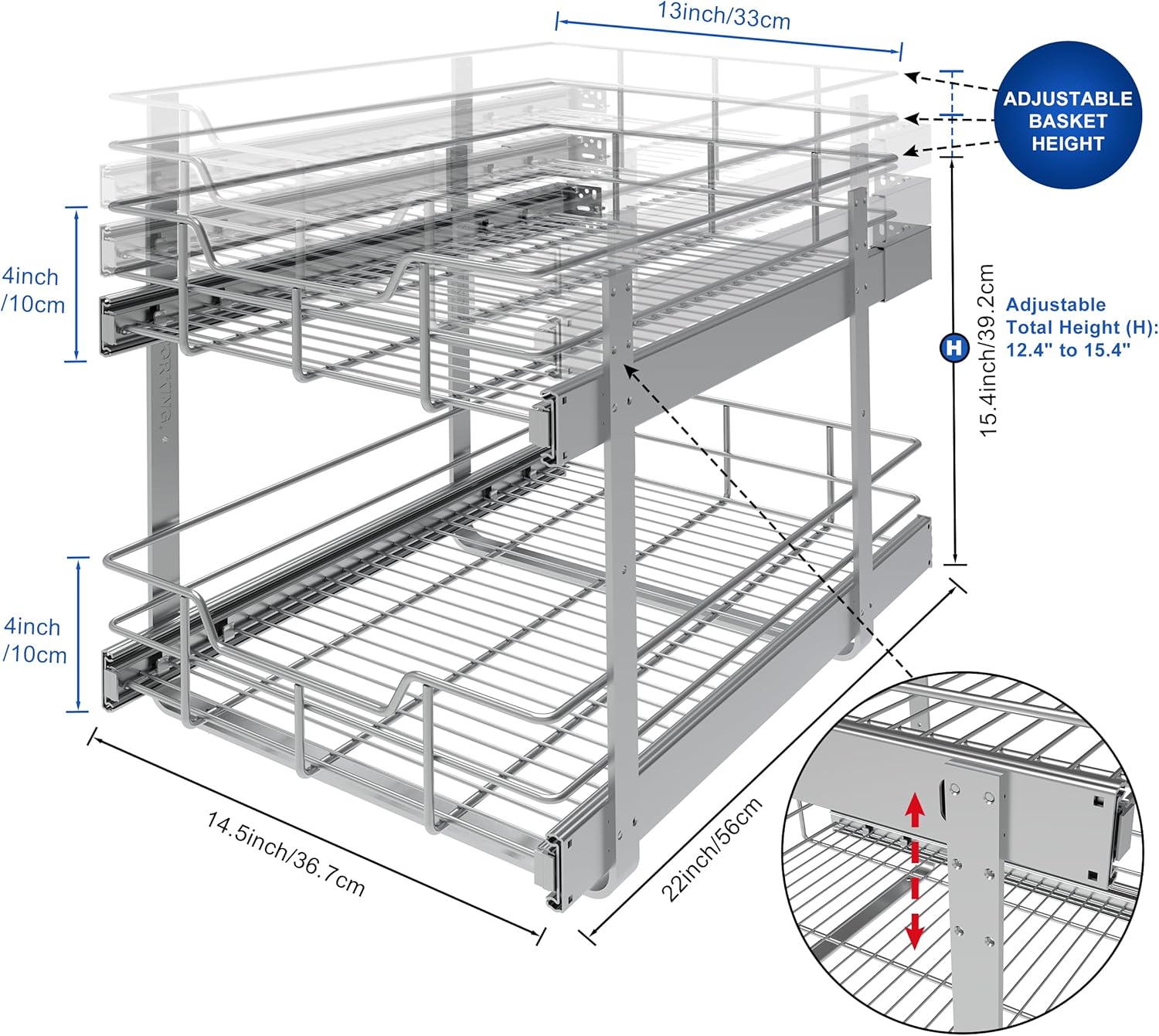 - Durable High Strength Reliable: Wire mesh made of high quality steel, underneath each drawer with 3 cross bars for supporting the heavy weight, even under the weight of heavy portable equipment this wire basket slide shelf will not sagging and bending. Industrial grade ball sliding system make our cabinet pull out shelve can handle up to 100 lbs. The chrome finish on the pull out organizer makes them increase hardness, wear resistance, corrosion resistance, and easy to clean.
