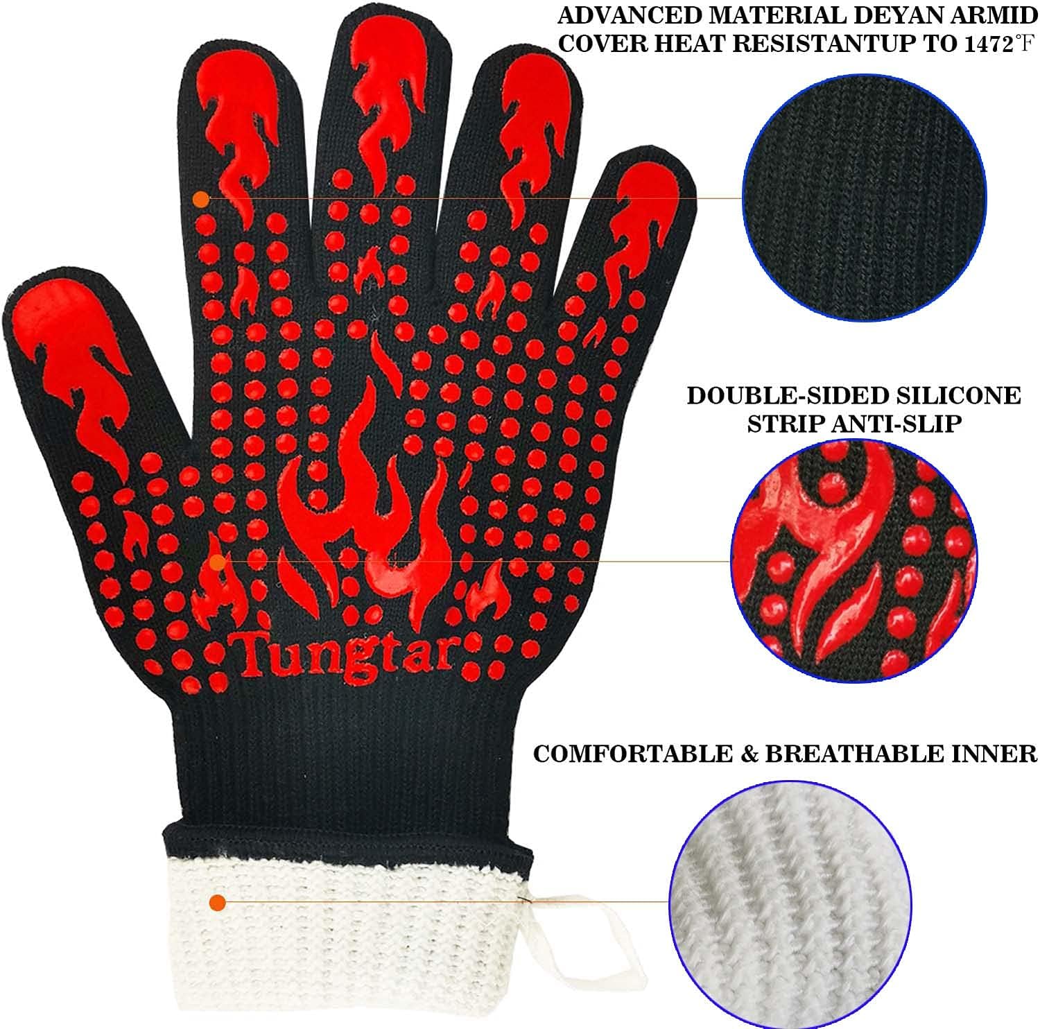 - 【Extremely Heat Resistant】:The bbq heat resistant gloves are made of Aramid fabric with silicone coating that can withstand up to 1472 ℉. It's designed specifically for the pit master with non-slip palm and five finger, so very excellent for smoker, BBQ, cooking, cutting, baking, grilling, or handling the hot items with the heat resistant gloves indoor or outdoor.