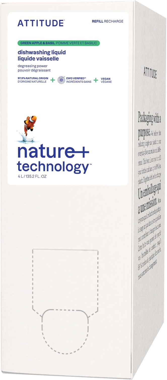 ATTITUDE Dish Soap Refill, EWG Verified, Plant-Based & Vegan Dishwashing Liquid, Naturally Derived, Green Apple & Basil Scent, 135.3 Fl Oz