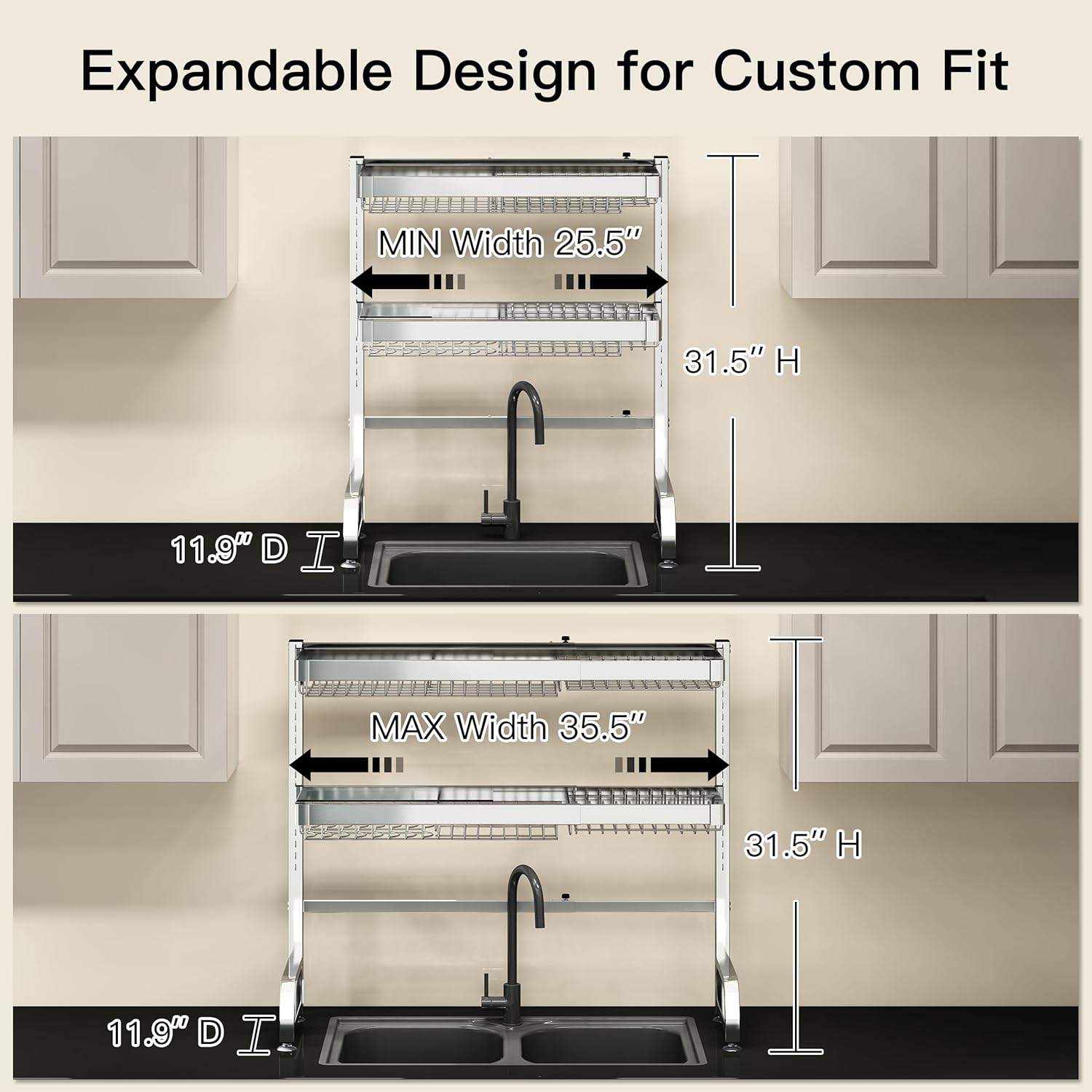 - ๐ Expandable Design for Custom Fit: Adjust the over sink dish drying rack width effortlessly to span most standard single or double sinks, adapting seamlessly to your kitchen layout. The dish drain modular design allows rearranging tiers and accessories to prioritize space for tall glasses, wide pans, or cleaning tools, maximizing vertical storage above the sink