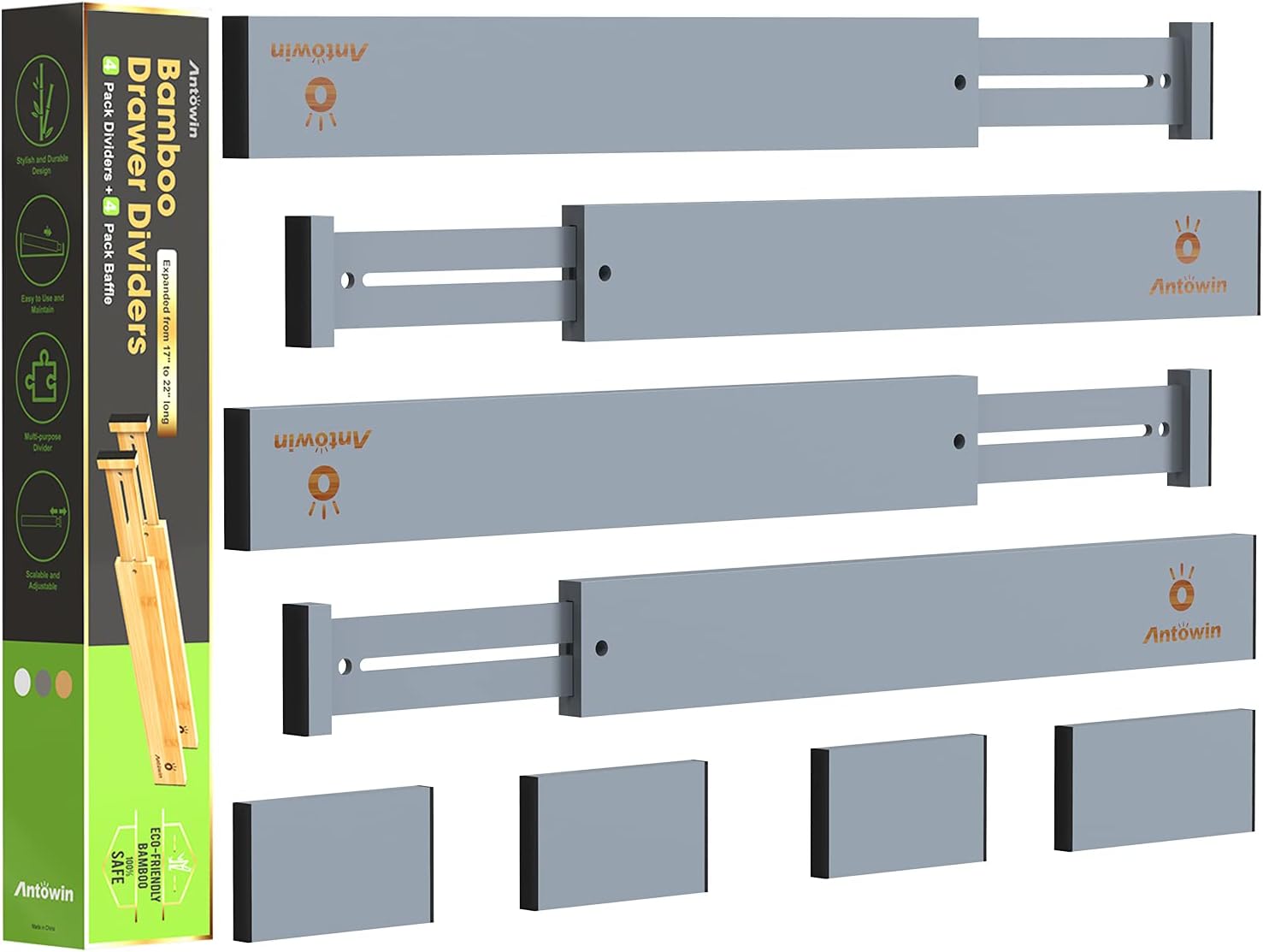 ANTOWIN Bamboo Drawer Dividers Organizers, Expandable Drawer Separators Splitter,17-22 inches Long Adjustable Spring-loaded Organizer for Large Utensil, Clothes, Tools Drawers (Grey)