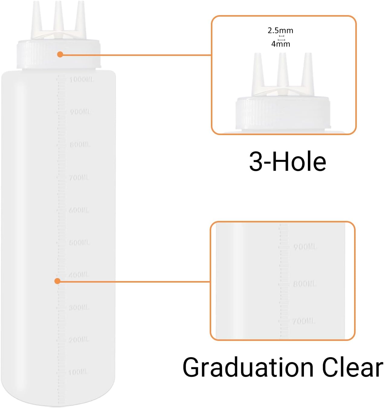 4 Pack 32oz/1000ml Plastic Squeeze Bottles 3-Hole Squirt Condiment Bottles Tomato Sauce Dispensers for Ketchup BBQ Dressing Paint Workshop Pancake Art Craft with 8 Chalk Labels and 1 Pen
