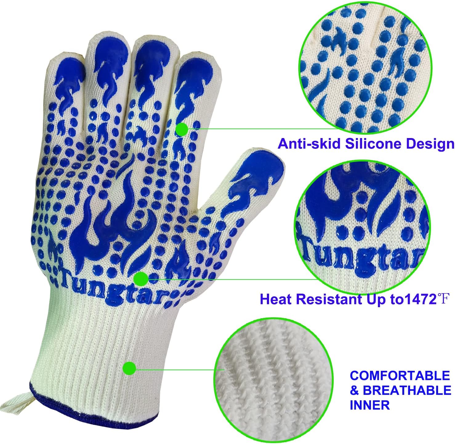 - 【Extremely Heat Resistant oven mitts】 BBQ heat proof ove glove EN407 Certified are made of Aramid fabric(same as Nomex and Kevlar) with silicone coating that can withstand up to 1472 ℉ and very excellent for oven, smoker, BBQ, cooking, cutting, baking, grilling and handling the hot items with the heat resistant gloves indoor or outdoor.