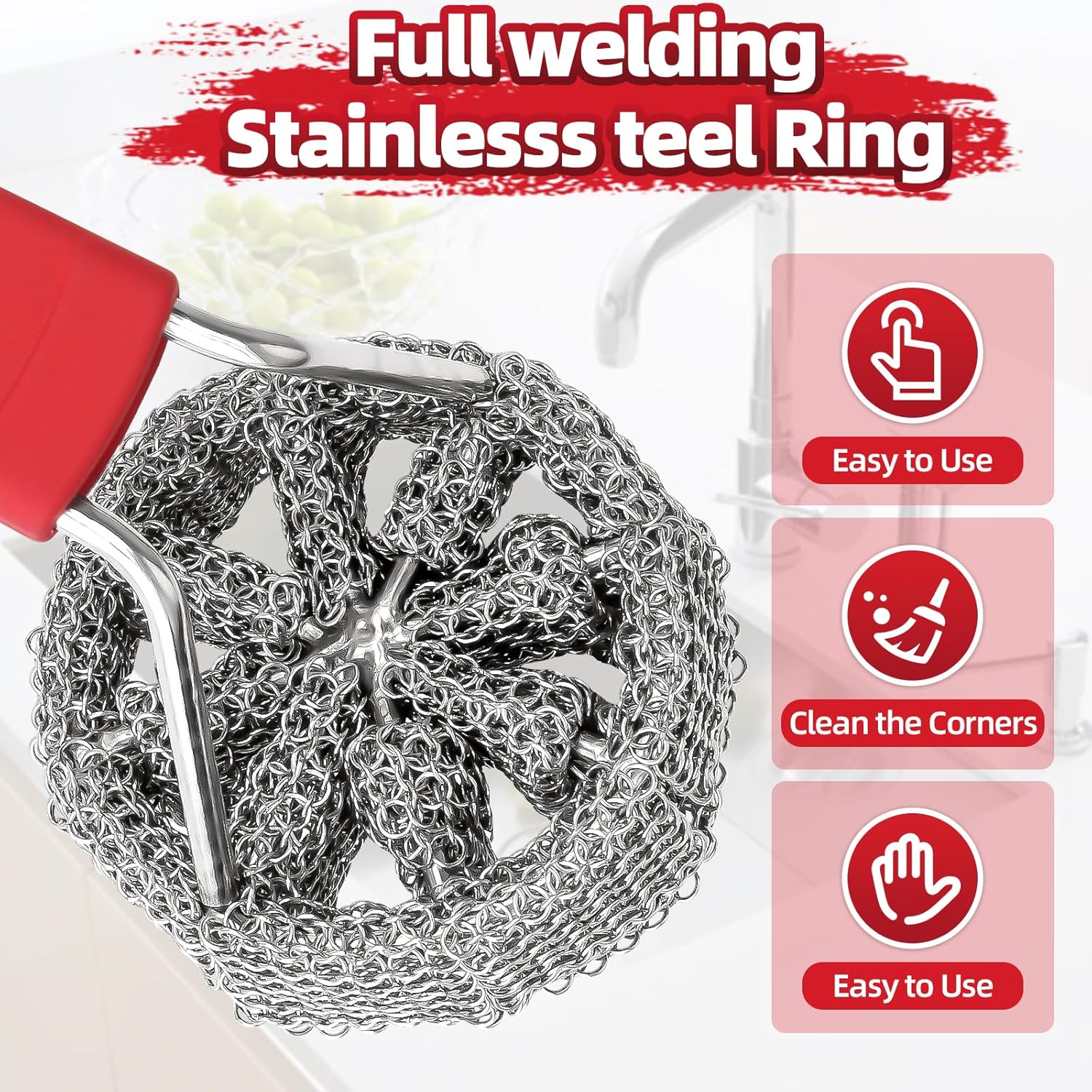 - ERGONOMIC DESIGN - 4 in 1 pattern and all rings welded closed with other rings, what means the chainmail scrubber willl never fall apart in daily use. The handle design for a better grip, these cleaners keep your hands away from the chain mail leading to less fatigue. The easy on the hands, flexible chainmail scrubber gets into any corner or crevice and is suitable for all cookware: pots, pans, grills, griddles, even BBQ mesh.