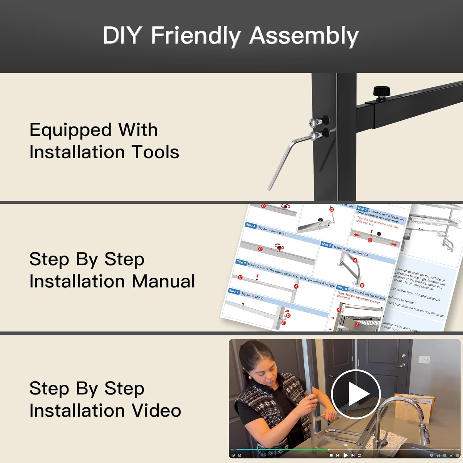 - ๐งฐ DIY Friendly Assembly with Tools: Includes a hex key and step by step visual guide for straightforward installation. Predrilled holes let you mount the sink dish drying rack horizontally above the sink without permanent alterations, perfect for renters or those avoiding wall damage. No technical skills required, assemble in minutes