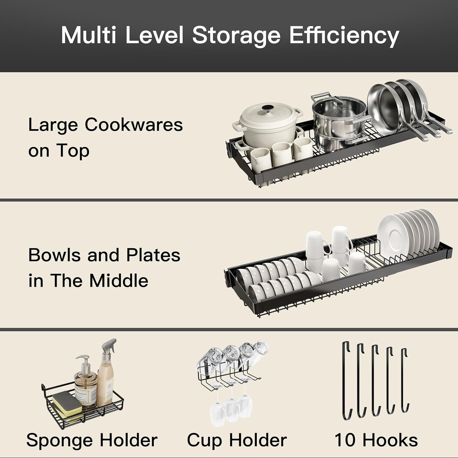 - ๐งบ Multi Level Storage Efficiency: Three spacious tiers organize dishes by type, large cookwares on top, bowls and plates in the middle, while dedicated sponge holder and hanging hooks keep sponges and brushes accessible. The dish rack over sink open grid design accelerates drying by promoting airflow, reducing water spots