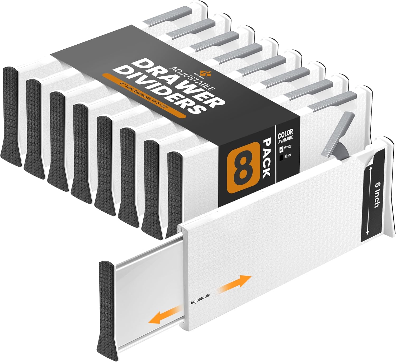 RAPTUROUS Adjustable Deep Drawer Divider – 6" Tall, Expandable 13-22", 8-Pack, Non-Slip Drawer Dividers for Clothes, Dresser, Kitchen & Office Organization (White)