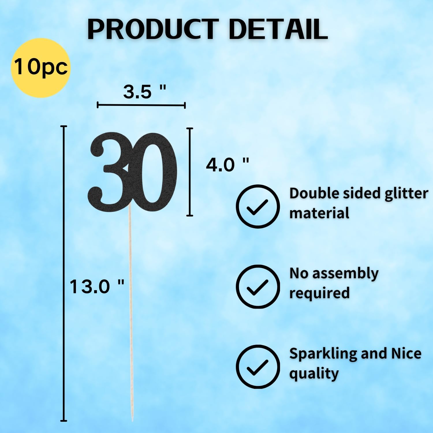 10-Pack Double Sided Glitter 30th Birthday Centerpiece Anniversary Centerpiece Sticks, Number 30 Table Topper Cake Topper for 30th Birthday Anniversary Table Party Decorations (Double Sided black)