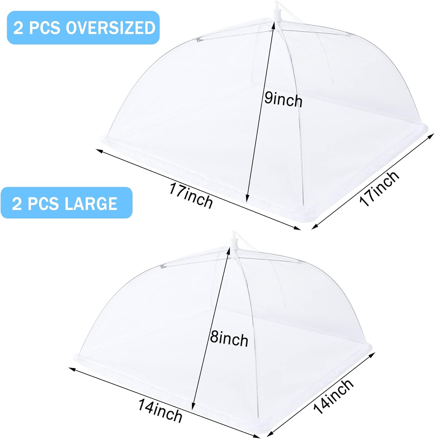 - Reusable and Collapsible: 2 pcs 17"x17" and 2 pcs 14 "x 14" food tent covers are very practical and reusable. It can hold 2-4 plates at a time. The bottom of the collapsible food cover is provided with a moderate lace edge, which acts as a barrier and is an effective food net.