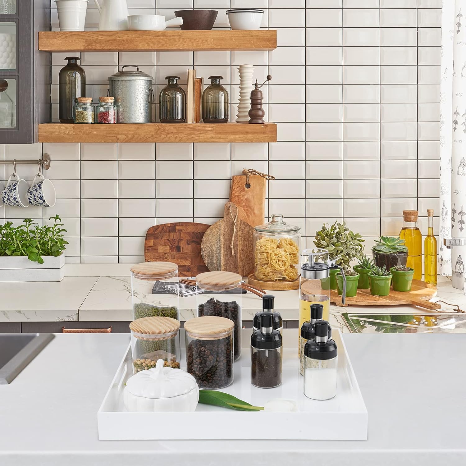 18×18 Inches Glossy White Acrylic Serving Tray with Handles Extra Large Ottoman Tray Decorative Trays Spill-Proof Coffee Table Space Saver Oversize Counter top Organizer Platter with Safe Edge