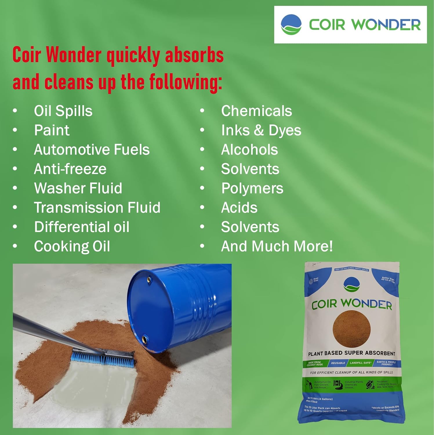- 3-in-1 Cleanup Power: Combines the performance of an industrial oil absorbent, latex/acrylic paint hardener, and dust-free sweeping compound in one eco-friendly solution.