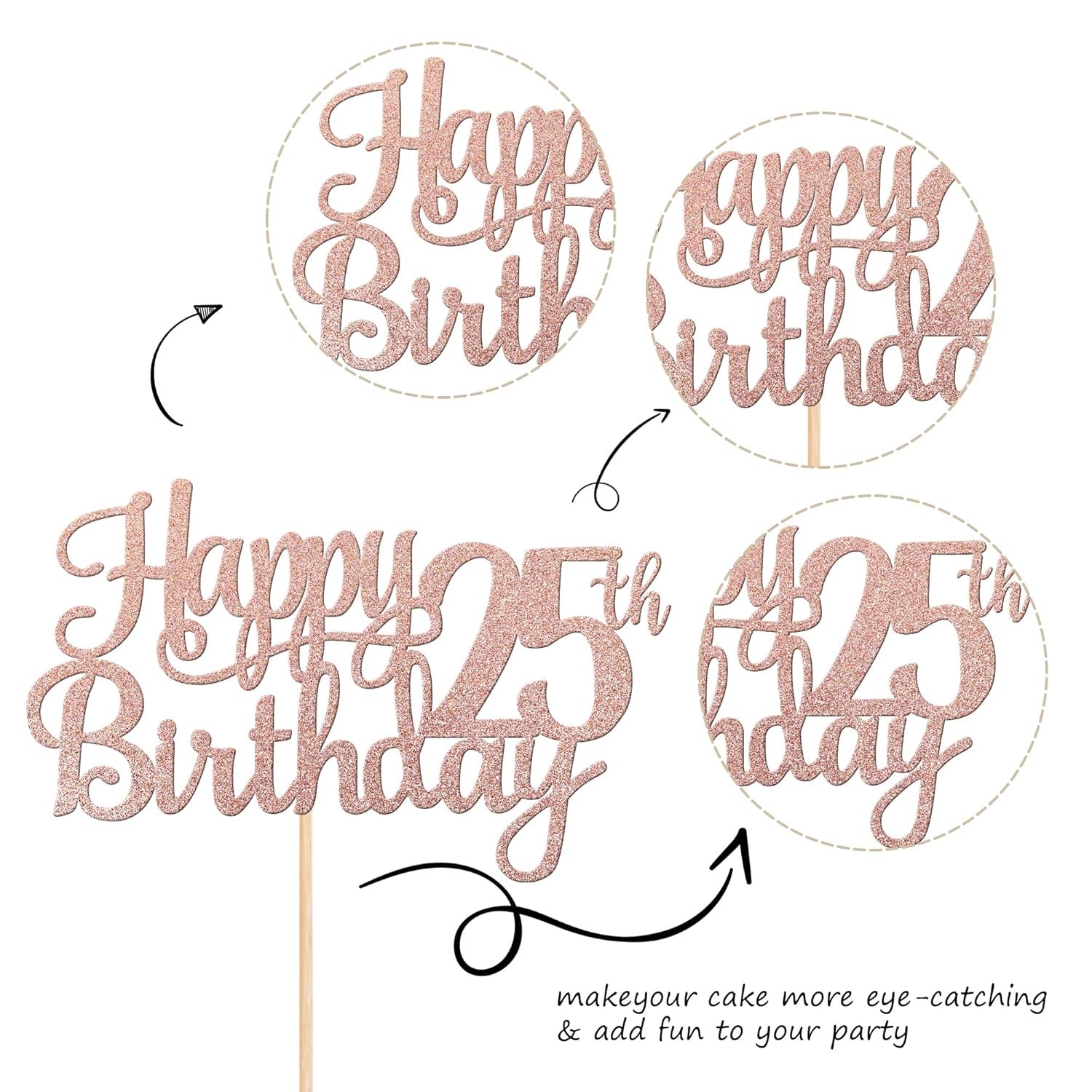 - Wide Usages ! The cake topper is perfect for happy 25th birthday theme party, cheers to 25 years birthday theme party cake decorations, they can make your cake more attractive and bring the fun to your party.You can also apply them for ice cream, fruits, cookies and other desserts.