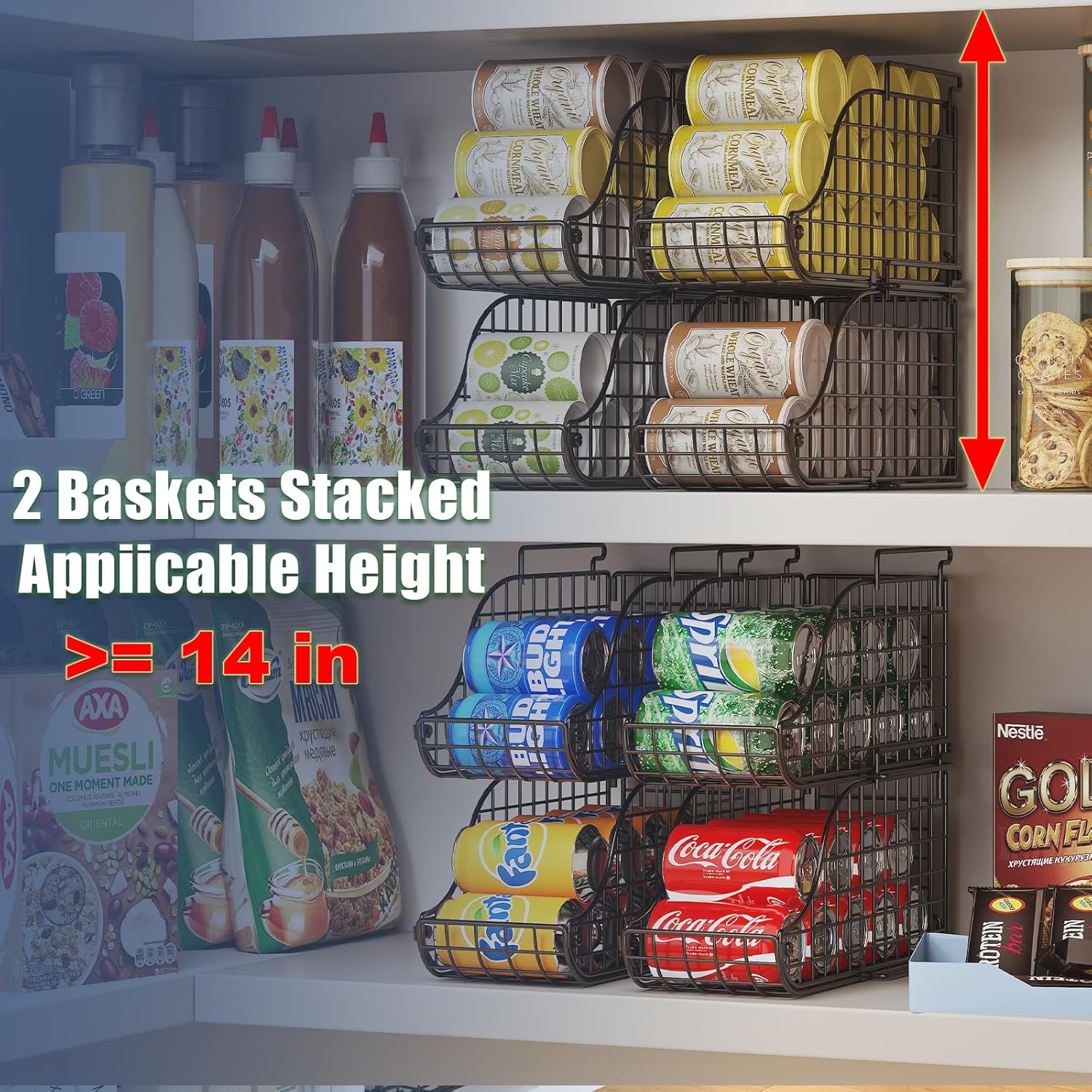 - STACKABLE DESIGN - This can organizer for pantry was the stackable design. You can use the soda can organizer on your kitchen countertop, table top, cabinet. You can overlay 4 baskets together or use each basket alone. You can use it to storage your soup can, pet food can, and the other canned food. You can also use it to organizer your dirnk and soda in your kitchen.