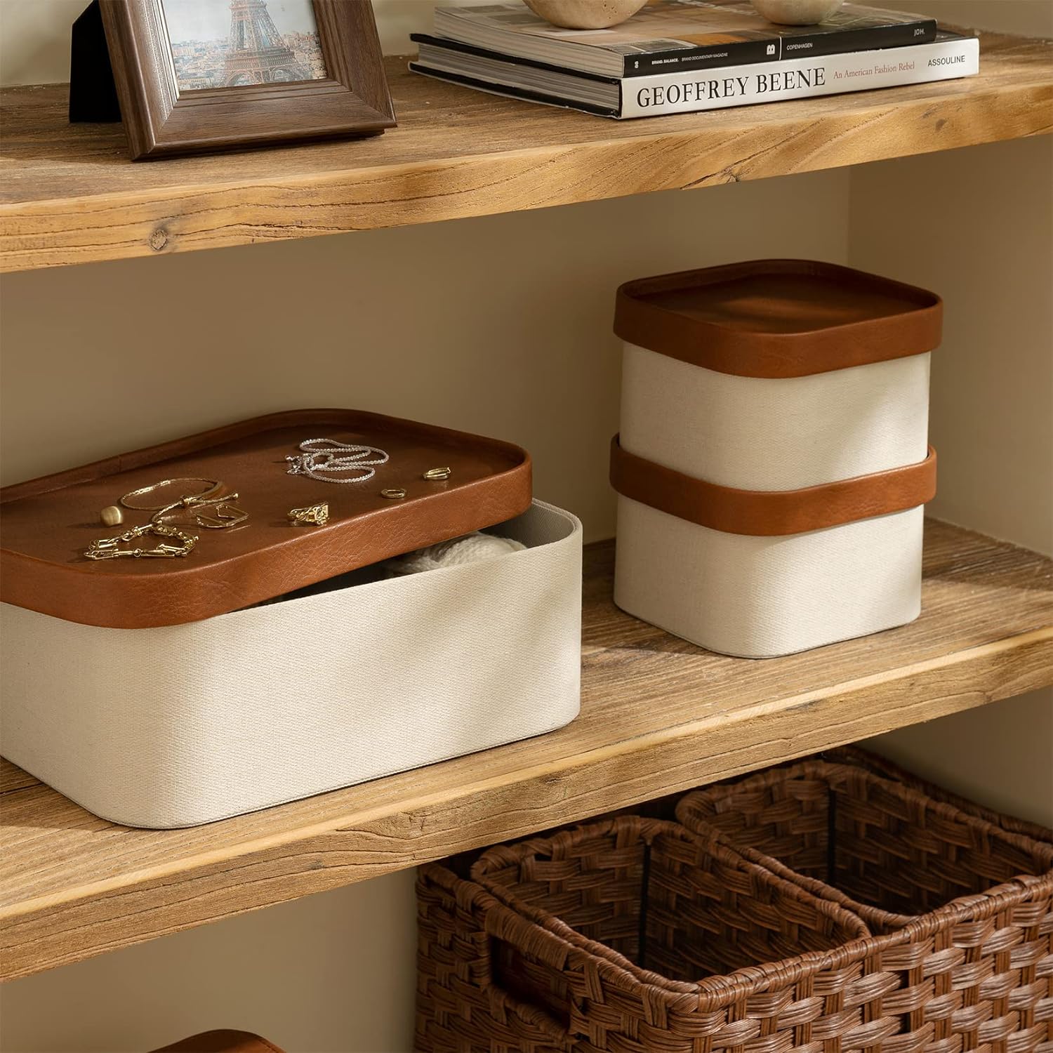 - SMART STORAGE - Every storage bin has a PU lid with a raised rim on each side. The lid can double as a tray for jewelry and other small accessories. This set of storage boxes comes in 2 different sizes, suitable for the living room, bedroom, and dresser to make your place neat. Size (inch): L-12.6LĂ7.9WĂ4.7H, S- 7.1LĂ5.9WĂ4.1H (Including lids)