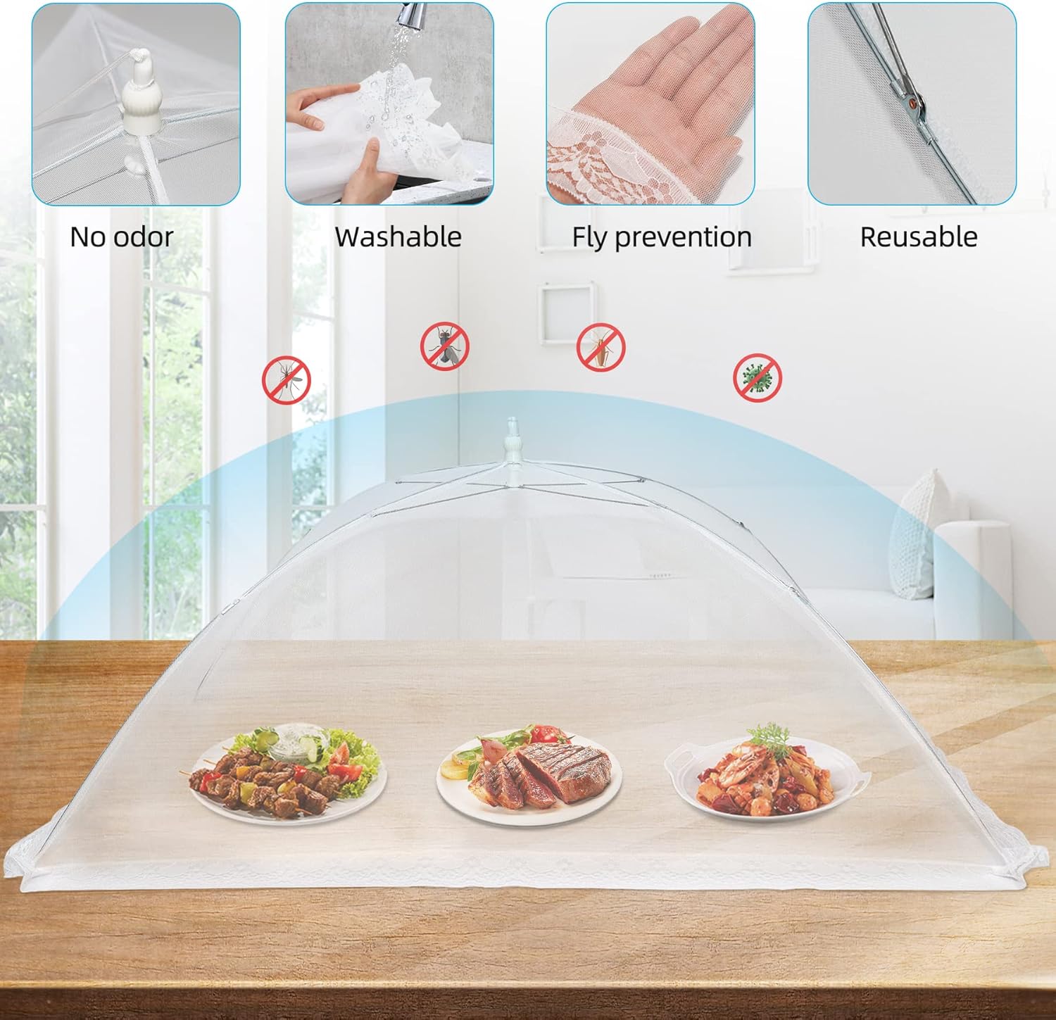 - FOOD COVER MESH: This is large food mesh screen very suitable for picnics and parties. Outdoor food coverage net can reduce stress and improve outdoor dining. The bottom of the foldable food cover is provided with a moderate lace edge as a barrier. It is an effective food web and will not affect the taste of food.