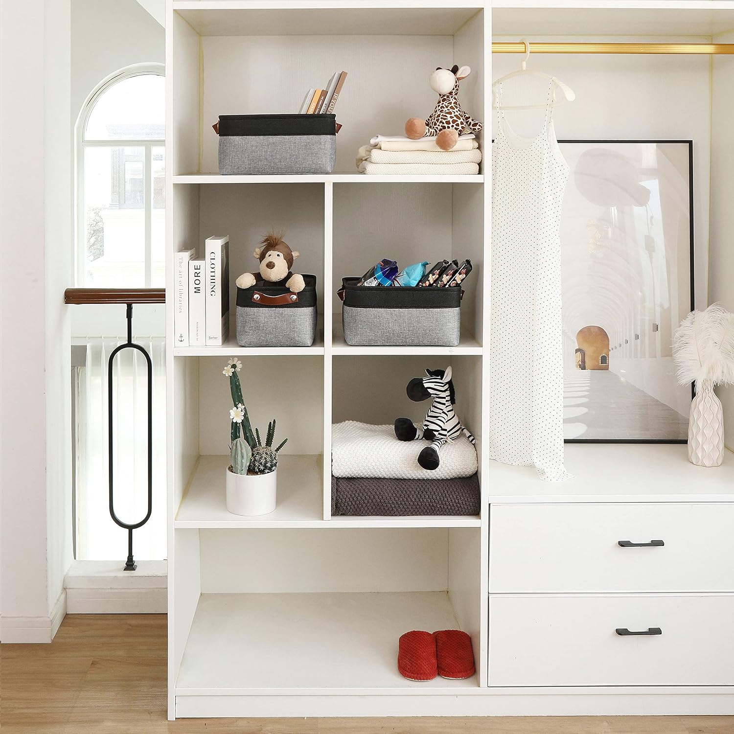 - Decorative Fabric and Vegan Leather – These versatile storage baskets for organizing your everyday life are made with a thick, high-quality fabric and fitted with leather handles to add a stylish touch to a living room, bedroom, office, or personal space.