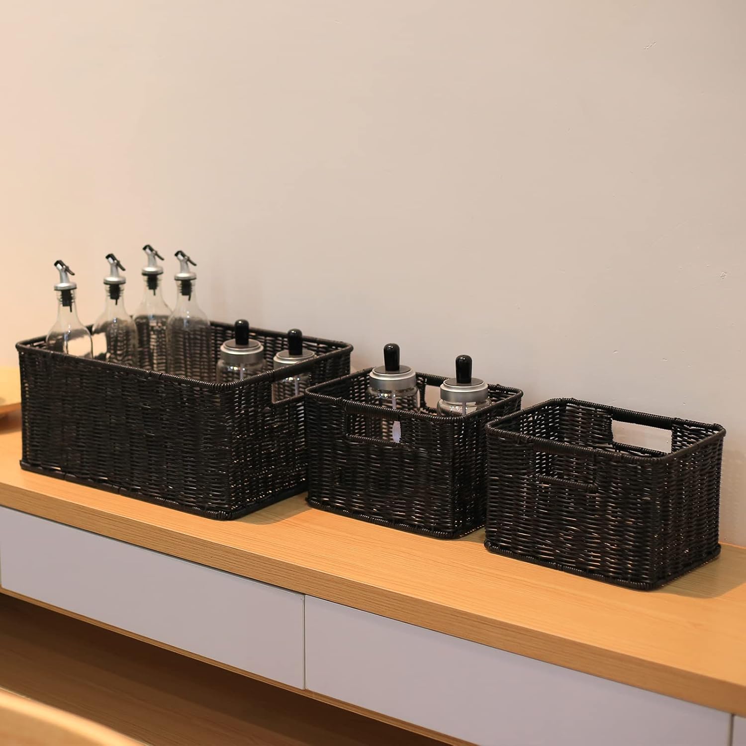 - Durable and Versatile: these pantry baskets are made of a metal wire frame and a handwoven polyethylene plastic strapping, hand-woven by skilled workers, clean up and organize your home with these rattan-style plastic baskets.