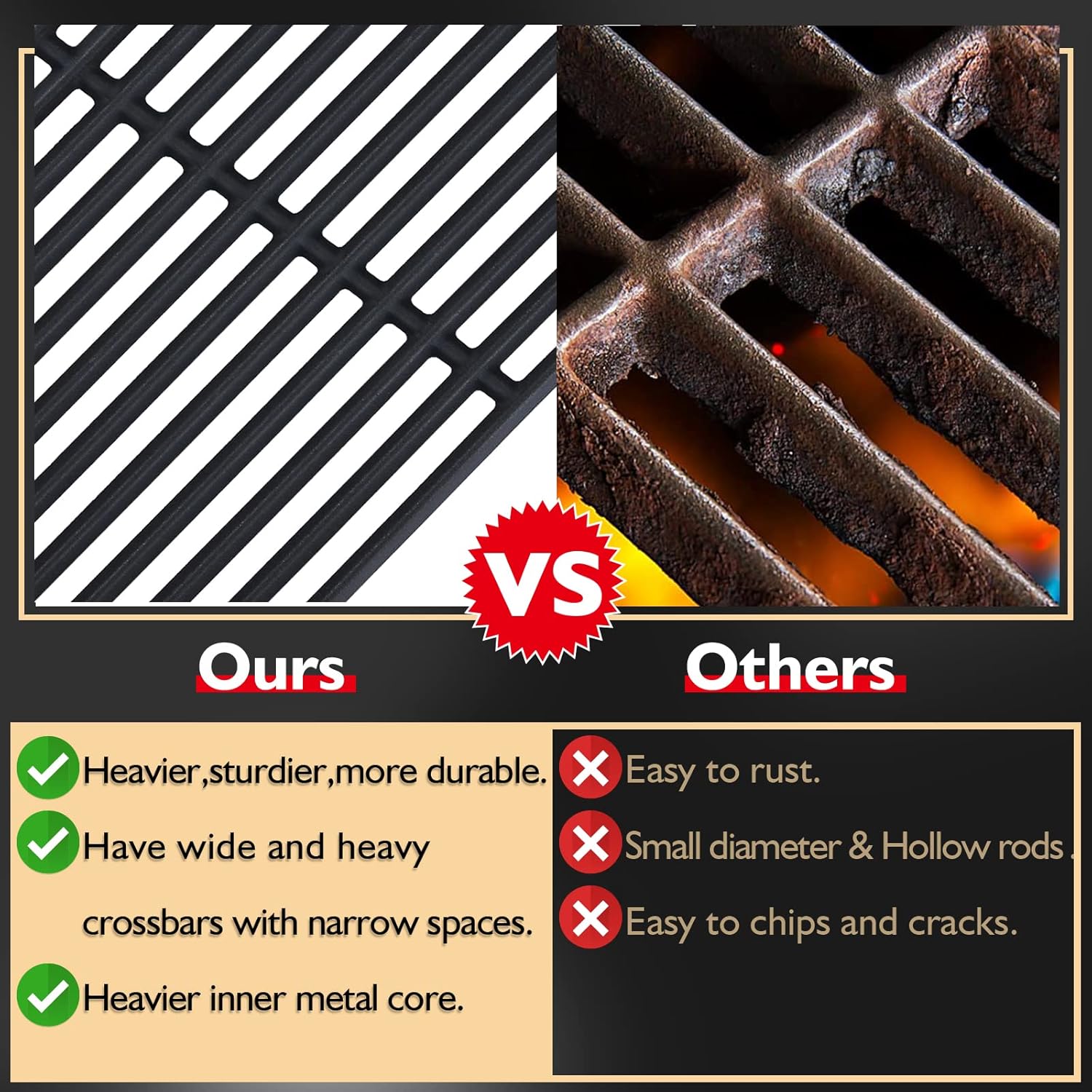 - 【Upgrade Heavier And More Durable】 The charbroil grill grates are made of cast iron material with mate enamel and solid material that heavier, sturdier and more durable than others. Charbroil grill replacement parts have wide and heavy crossbars with narrow spaces in between. Charbroil grates replacement are made of heavier inner metal core, which will hold more heat and translates into better quality grilled foods.