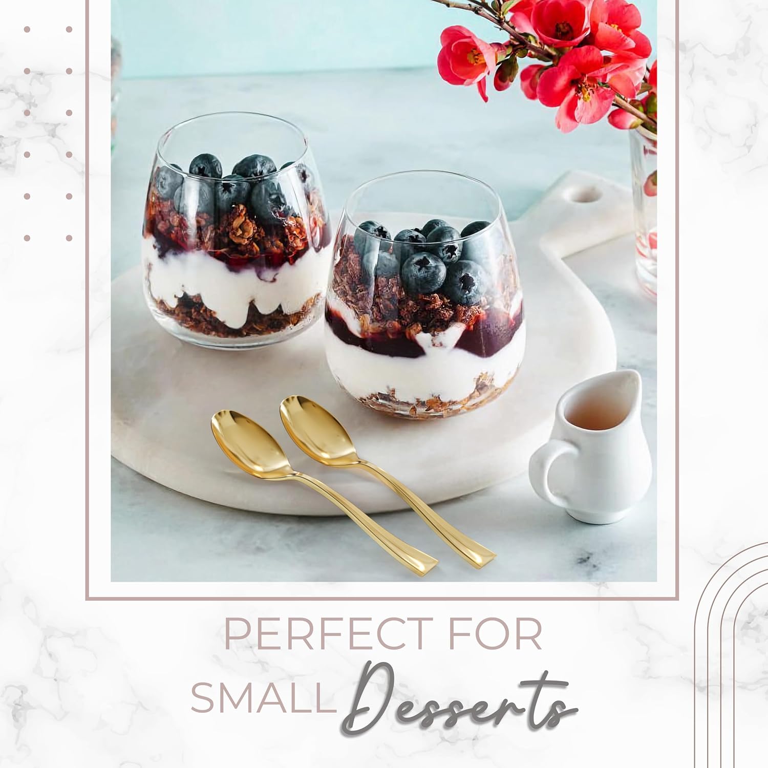 - Multi-Use Spoons - Gold mini plastic spoons are small plastic spoons that are versatile for a variety of uses, such as serving desserts, appetizers, or even stirring cocktails. They provide an elegant look that can be used for formal events or everyday use.