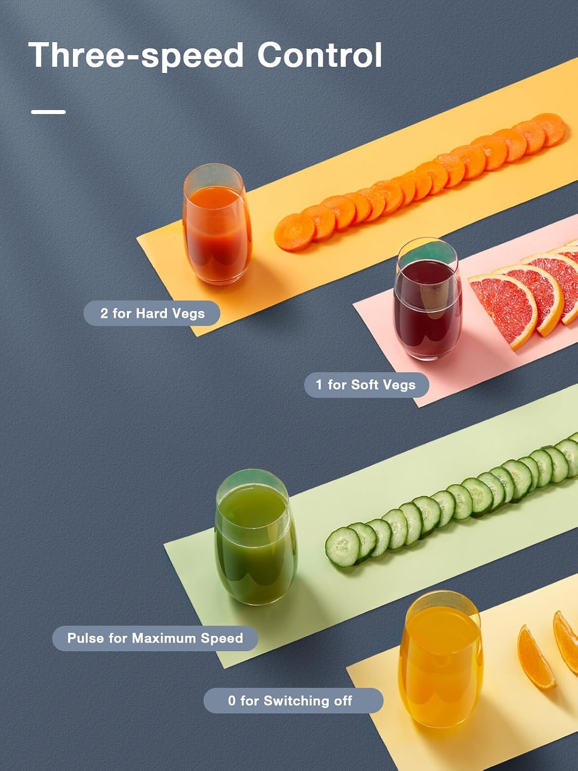 - 3-Speed Functions - "1" is a low speed, for soft fruits vegetables like oranges, watermelon, tomato, etc; "2" is a high speed, for hard food like apple, carrot, celery, etc. βPβ is the highest speed(Reach maximum speed after release). Customize your favorite juices, it makes the kitchen more colorful, you could juice a bunch of fresh juice and drink them to replenish energy and nutrition when needed