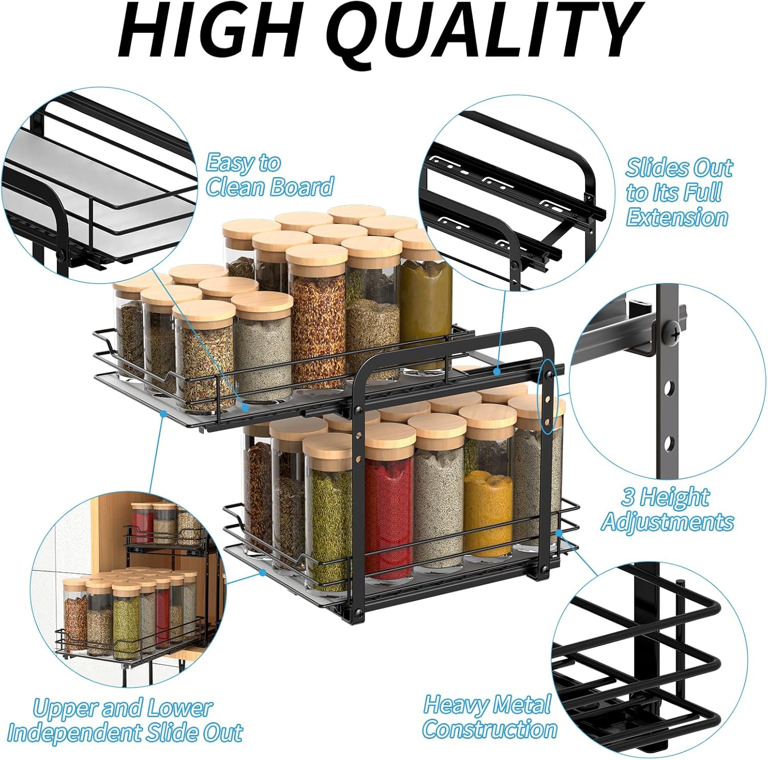 2-Tier Spice Rack, Pull Out Spice Racks Organizer for Cabinet, Height Adjustable Heavy Duty Metal Basket for Inside Cabinets & Pantry Closet (7.5''Wx10.5''Dx9.5''H)