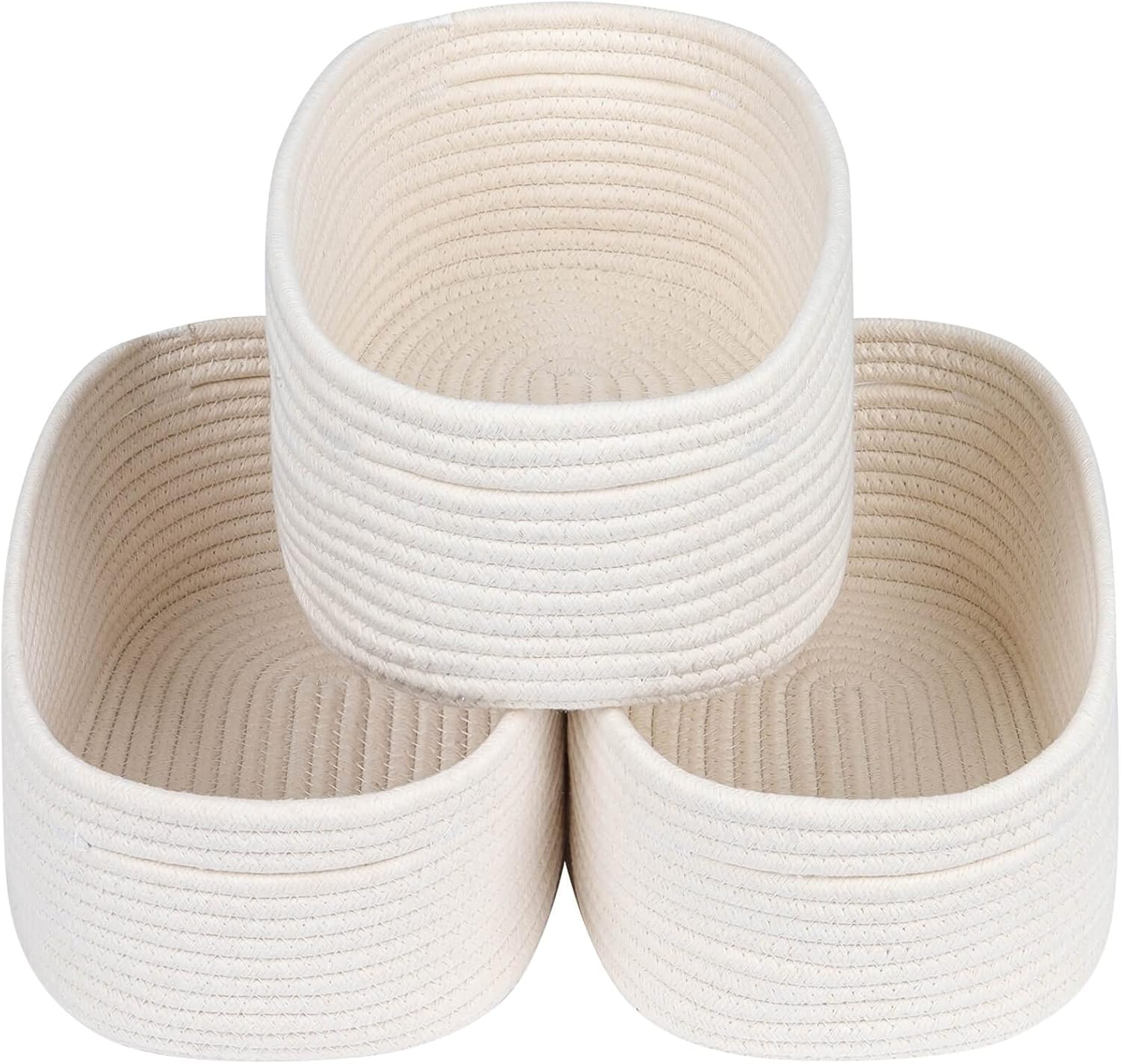 - Classy Natural Cotton Rope Storage Baskets-High quality well made. Very sturdy and a cute modern style. Durable woven rope, Long-lasting, skin-friendly, soft and attractive. You need these adorable baskets to put some supplies in, diaper, jewelry, cosmetics, makeup brushes, tea bags, storing smaller toys, toddler socks, candy