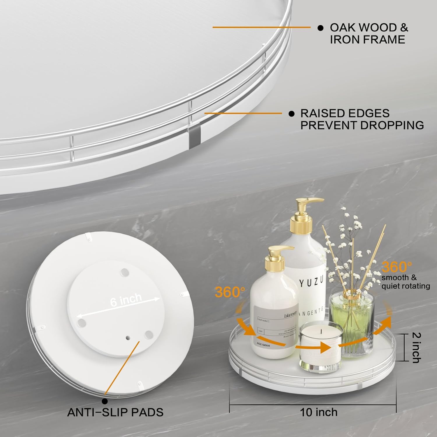 - ๐ง๐ต๐ผ๐๐ด๐ต๐๐ณ๐๐น ๐๐ฒ๐๐ถ๐ด๐ป: The turntable tray features a smooth and silent 360ยฐrotation; Bottom slip-resistant pads for stability and protect your countertop from scratches; Raised edges on each organizer tray to keep items from falling out; Easy to use, no installation required