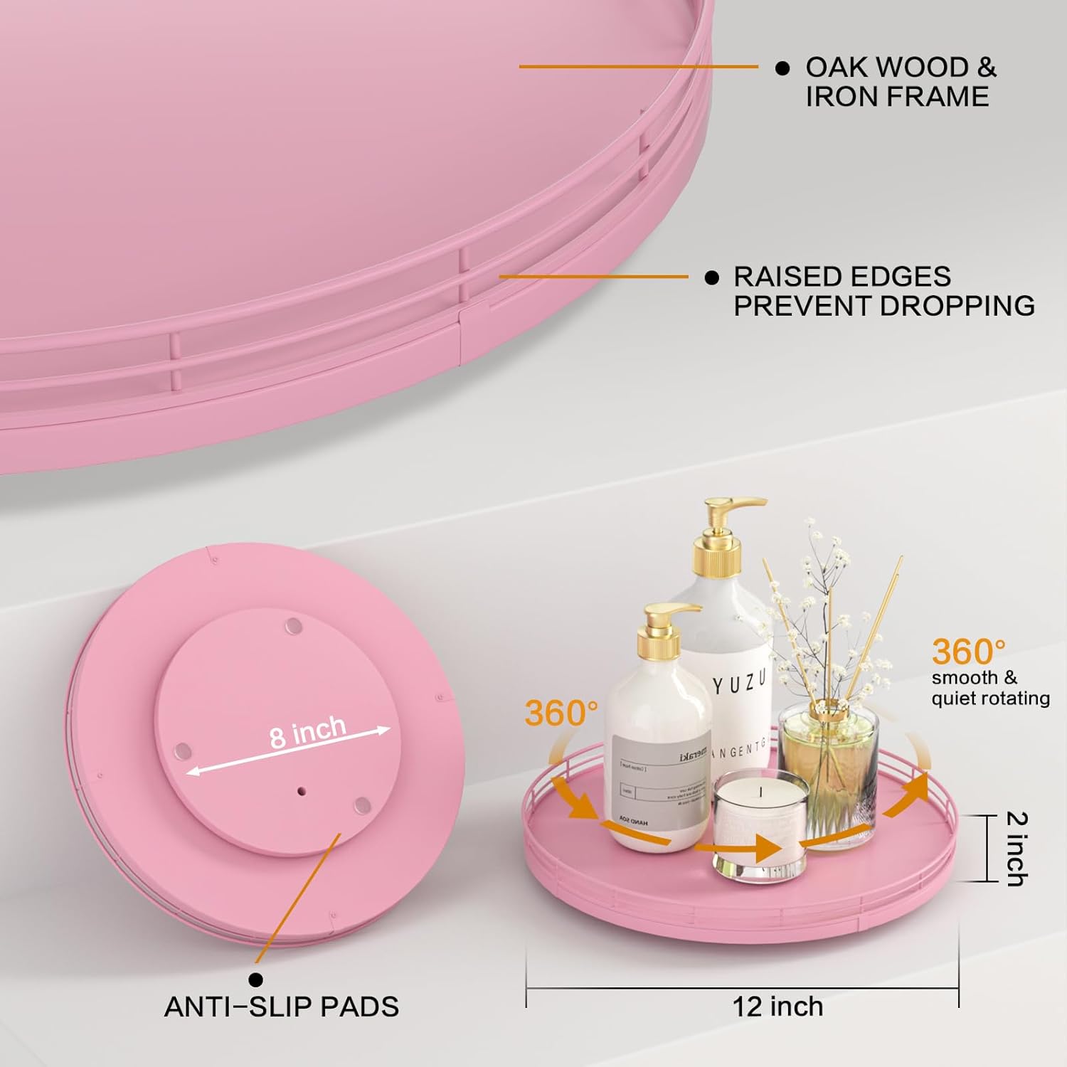 12" Oak Wood Bathroom Tray for Counter, Vanity Tray for Perfume Lotion Candle Makeup Jewelry Sink Soap Holder Turntable Dresser Organizer Countertop Coffee Table Decor Organization and Storage Pink