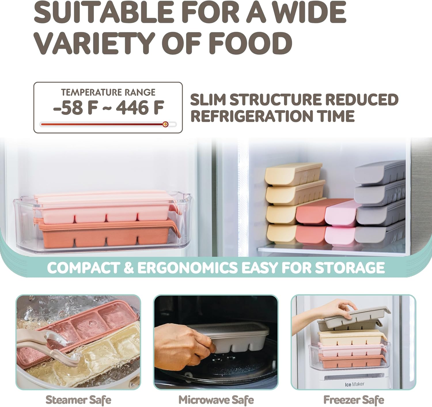 - ā Slim and Compact Design: These silicone freezer containers are available in 4, 6 or 12 compartments, featuring a stackable, ultra-slim and ergonomic design for easy storage. The ultra-wide area which receives cold air ensures a faster freezing process of the contents!