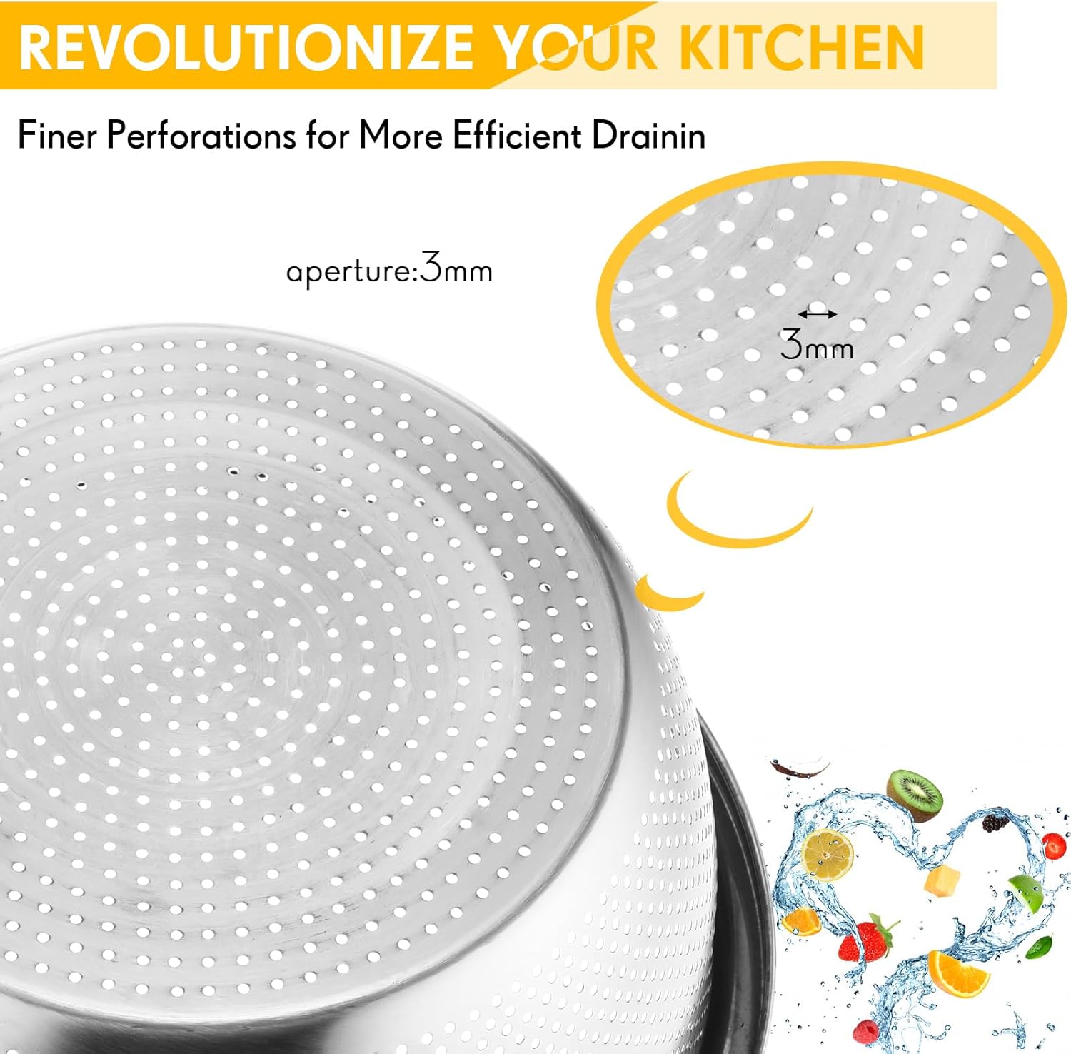 - Micro Perforated Design: with its perforated 3 mm small holes design, the stainless steel mixing bowl set effectively strains and drains faster, making them ideal for pasta, fruits, vegetables and more