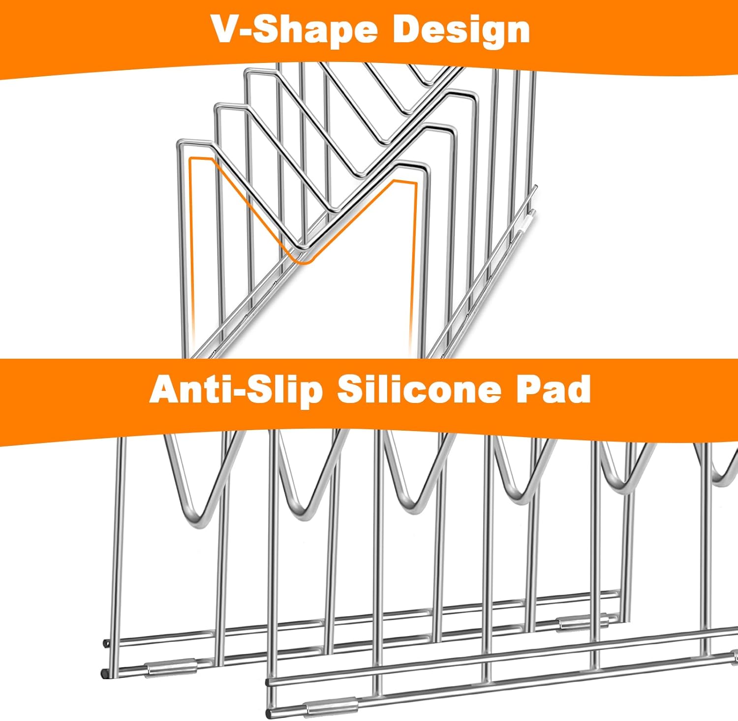 - ANTI-SLIP PAD: Non-slip pads on a pot lid rack provide stability, preventing the rack from sliding or tilting during use, protecting the countertop, reducing scratches, enhancing user experience, and extending the lid rack lifespan.