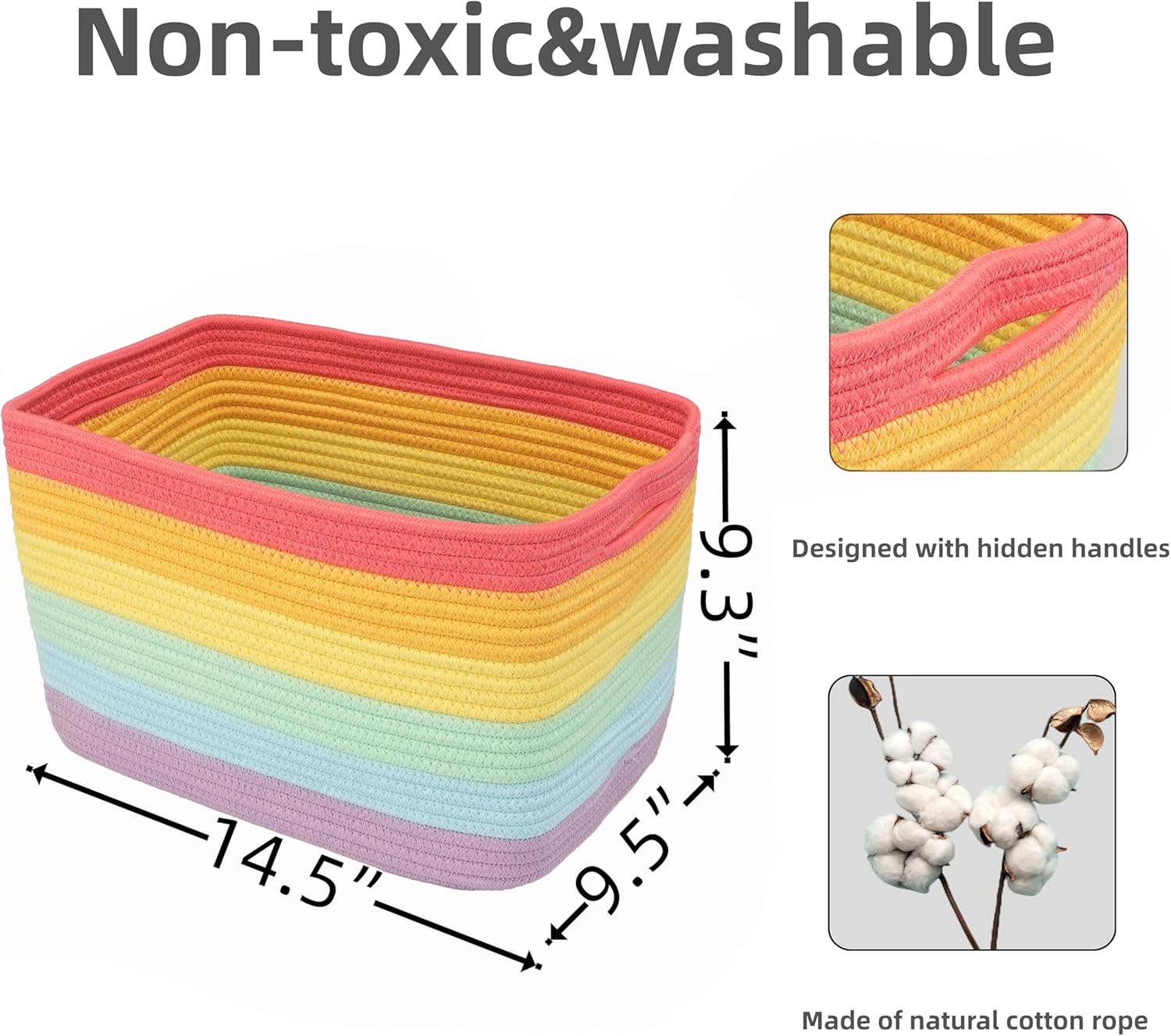 - 1, Medium to Large rectangle woven basket for storage: Our Rainbow rope basket with handles size is 14.5”X9.5”X9.3”. Designed as home storage basket for organizing or storage bins. Could use as cube storage bins,nursery bins,toy basket, pet basket, book basket, towel basket, clothes basket, nursery basket, wicker basket for storage and more. Perfect as storage basket for shelves or closet storage bins to store household items.