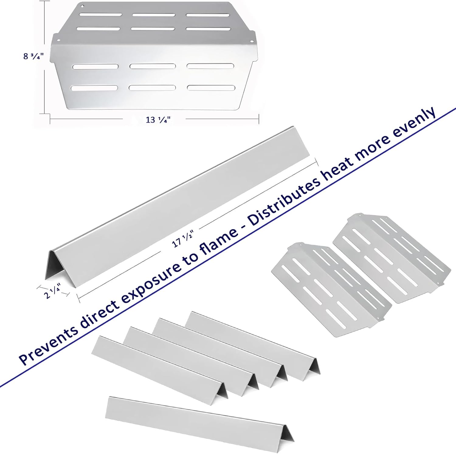 - 4 Pack Burner Tubes: 19 1/2" & 5 Pack Flavorizer Bars: 17 1/2" x 2 2/8" x 2 3/8" & 2 Pack Heat Deflector: 13 1/4" x 8 3/4". Sold grill burners and flavor bars and heat deflectors in a set, more convenient for you to rebuild your grill