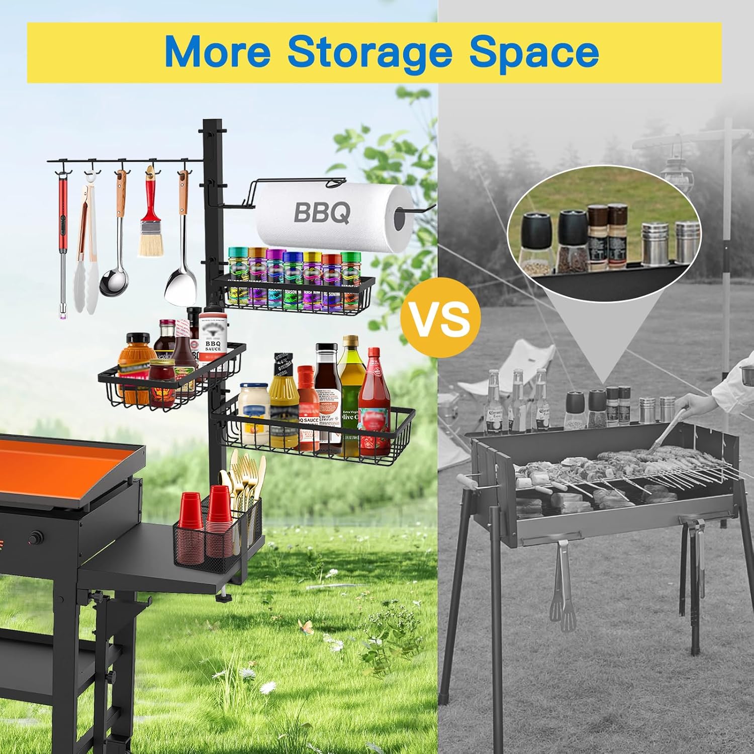 - 【High Quality & Large Capacity】: This blackstone griddle accessories adopts high-quality powder coating + high-quality steel material structure to ensure its durability. In addition to this, we have equipped the product with a total of three spice racks. With a 10-in-1 tool hook and paper towel holder, all barbecue supplies are organized and stored at once, so the countertop is no longer cluttered!