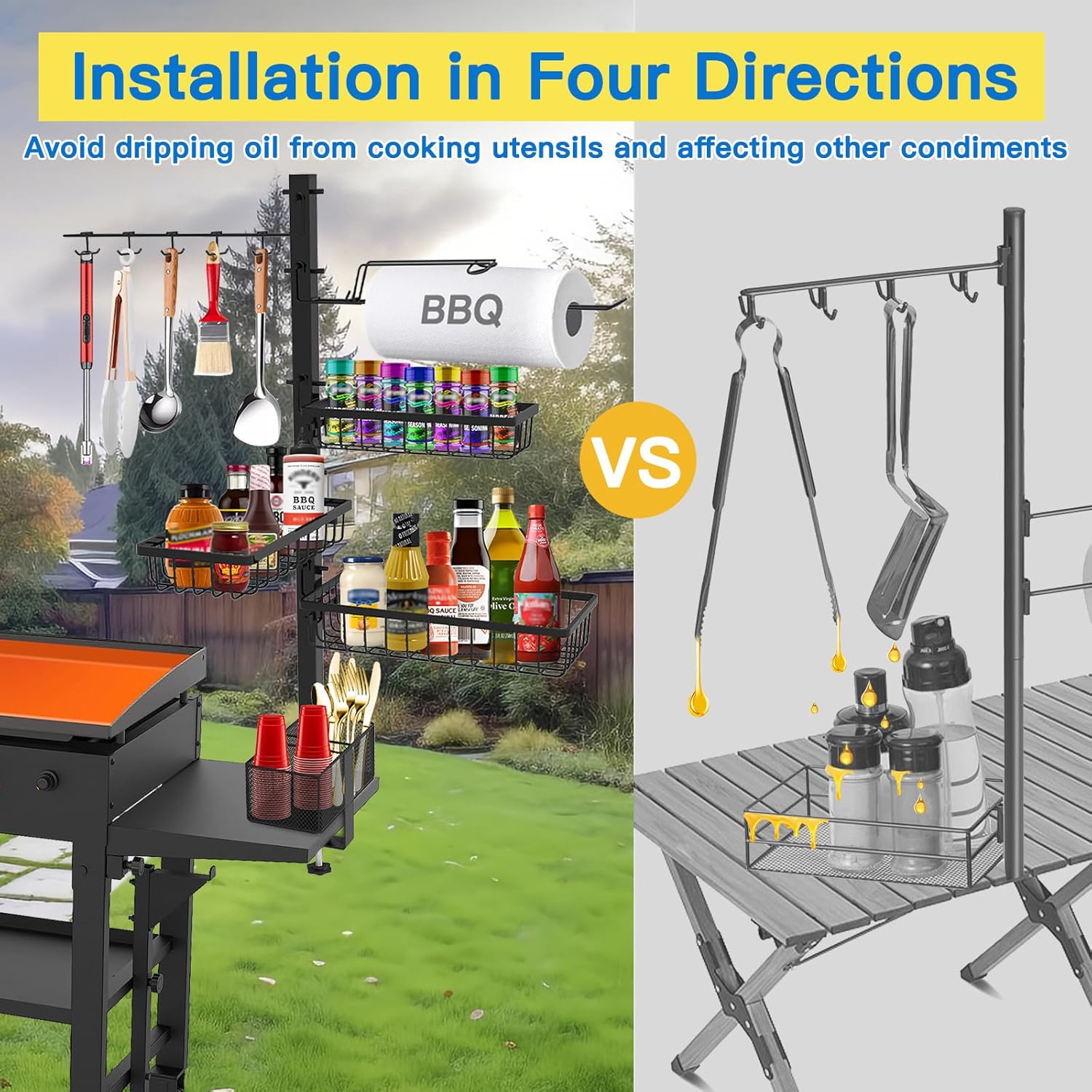 - 【New Upgraded Blackstone Accessories】: We have upgraded the structural design of this grill accessories for outdoor grill so that it can be selected in four directions. You can choose more freely when installing parts such as paper towel holders and condiment baskets. In the desired hanging direction, you can no longer worry about oil dripping from the upper hanging accessories onto the condiment jars!