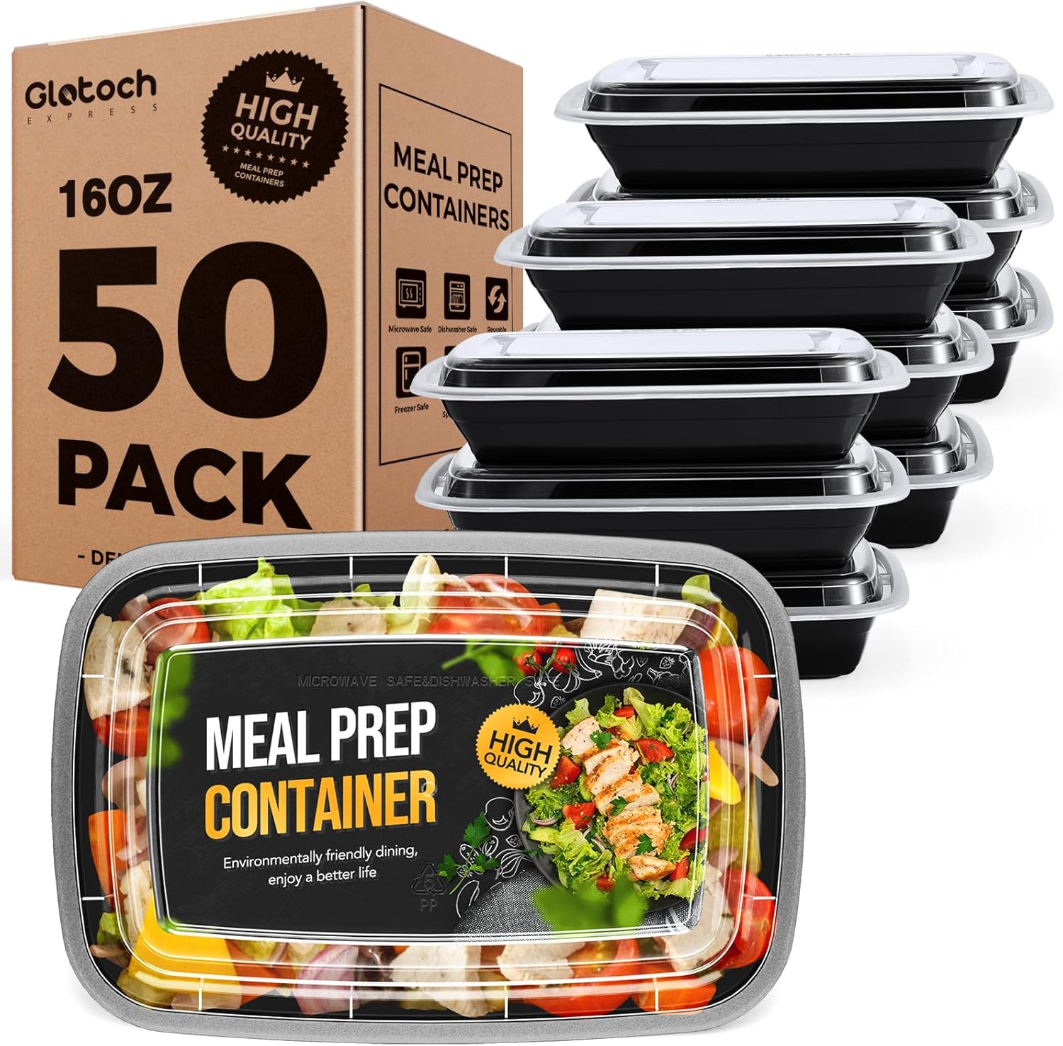 100-Piece (50-Pack) 16 OZ Meal Prep Containers Reusable with Lids, Sturdy Leakproof & Food Safe, Microwave, Freezer, Dishwasher Safe To Go Food Containers, Plastic Take Out Containers, Black
