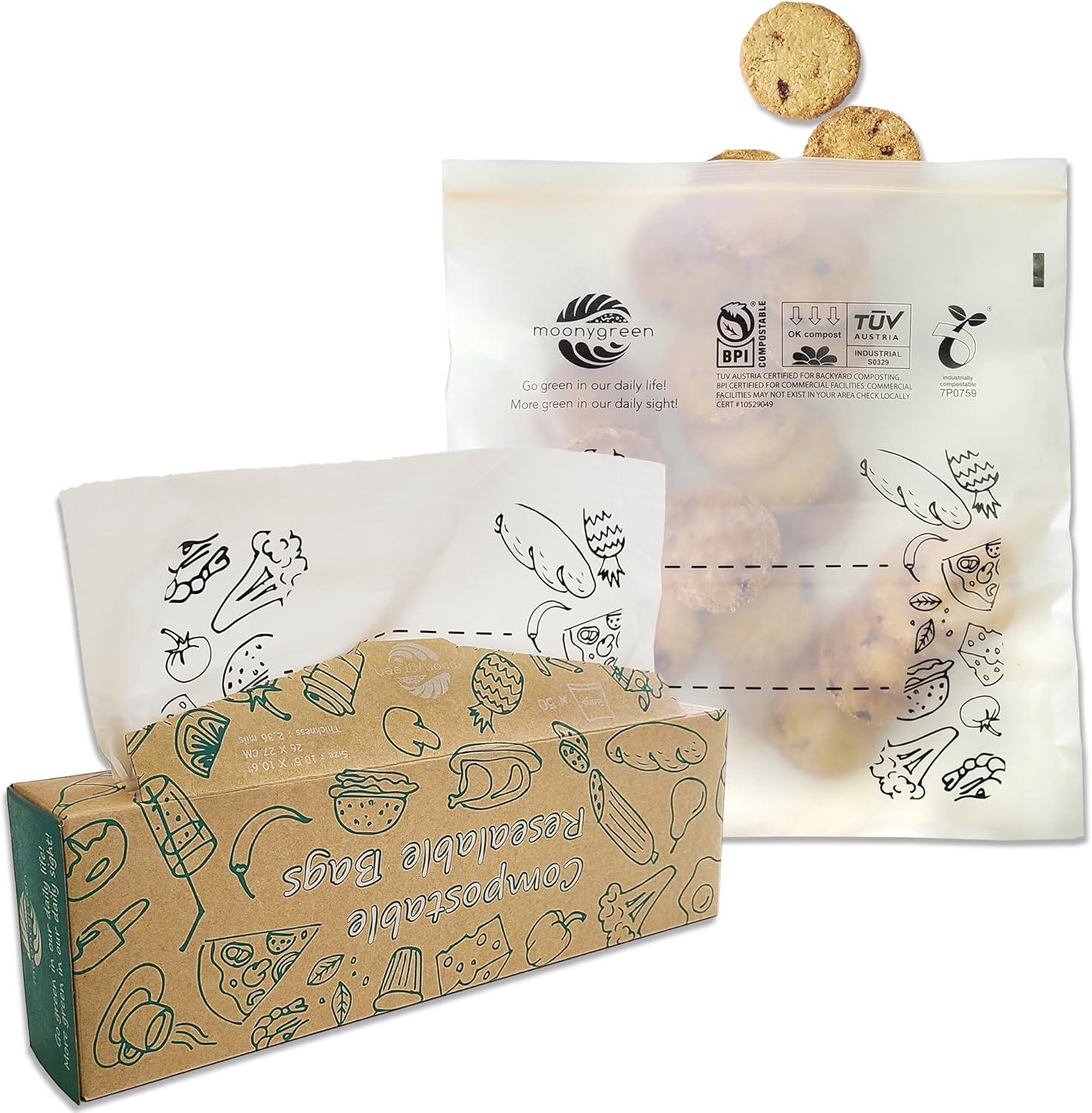 - š± Made from nature, Return to nature : Moonygreen Resealable Food Storage bags are made from vegetable. Holds up when you use it, breaks down easily when you are done with it. Most importantly, Moonygreen bags will return to nature as H2O & CO2, without leaving any plastic or micro-plastic. Best choice for reducing the use of plastic as well as saving our Earth!