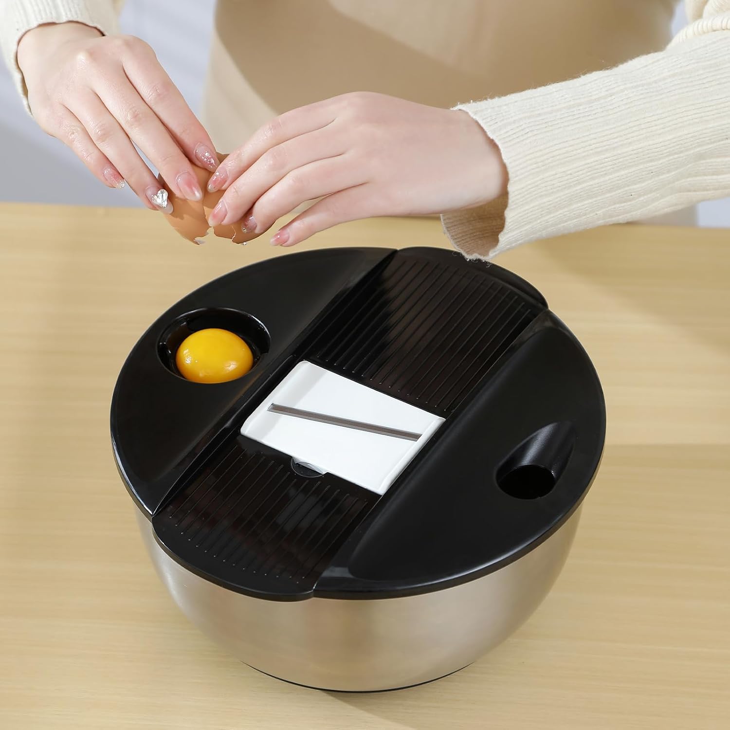 - Versatile Set:Salad spinner with vegetable slicer,mixing bowls with lids,includes a strainer,5.3 Qt bowl,mixing lid,5 the slicer,and an egg yolk separator for a seamless cooking experience.This multi-functional set allows you to wash,drain,mix,and chop all in one,making it a must-have kitchen essential.