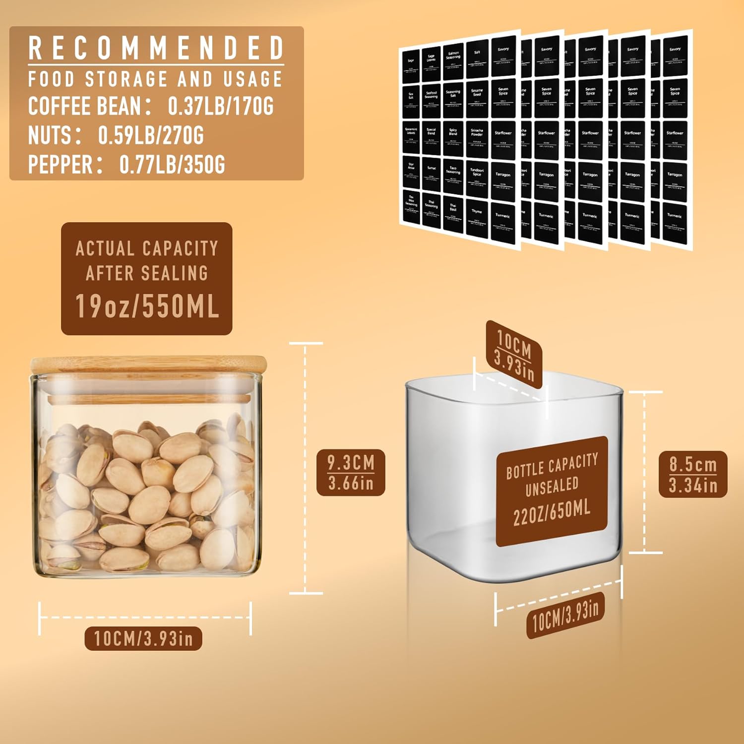 - [Extensive use] Our glass jars with bamboo lids are not only suitable for storing dry food such as beans, salt, sugar, spices and seasonings in the kitchen, but also for storing small items such as cotton balls, cotton pads and headbands in the bathroom or vanity.Contents: 6 storage jars with Black Lable. Size: Capacity is 22oz/650ml and dimensions are 10x10x9.3cm. Also included are oil and water resistant labels,