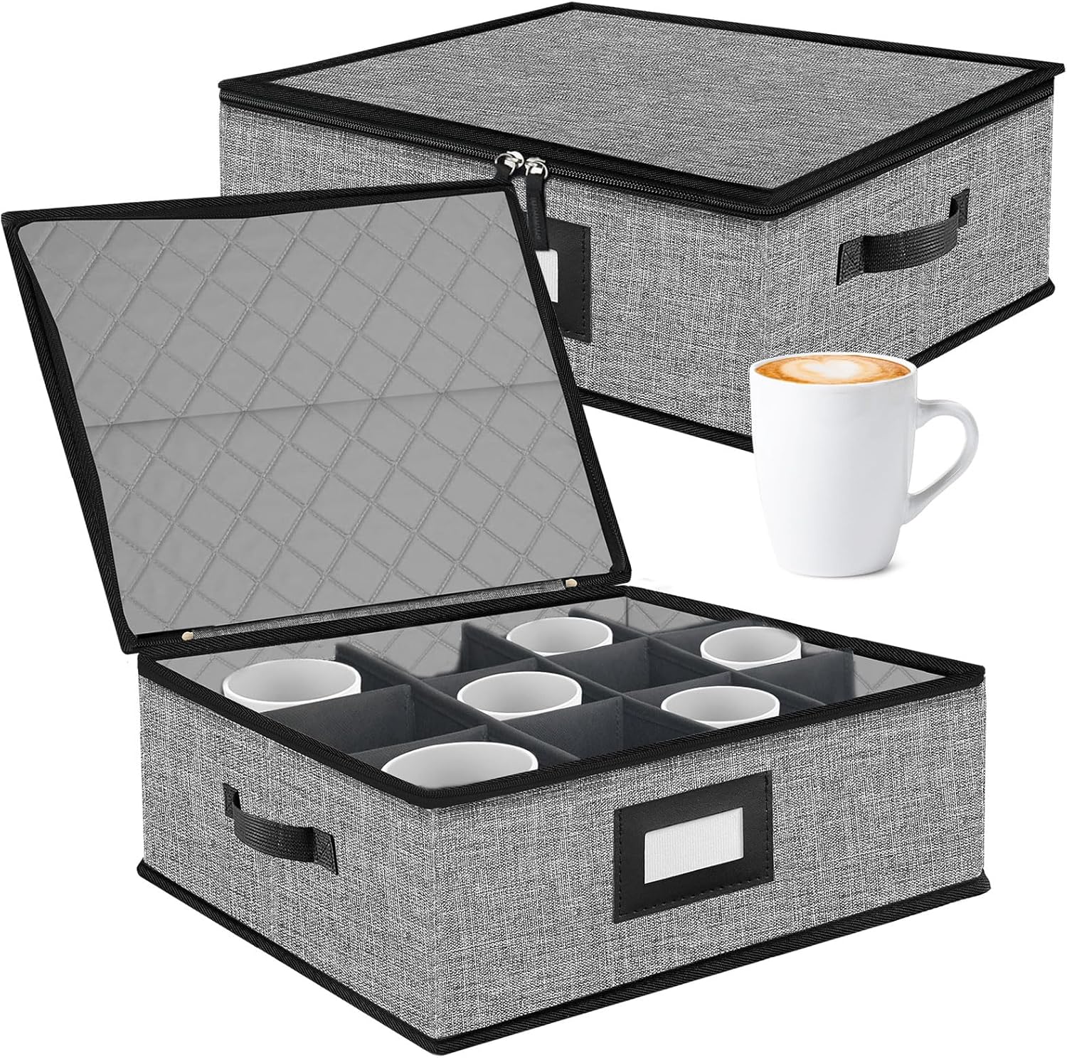 2PACK Quilted Mug Cup Storage Box-China Storage Containers Hard Shell,Cup Storage Containers with Lid for Moving Transport,Kichen Dinnerware Storage