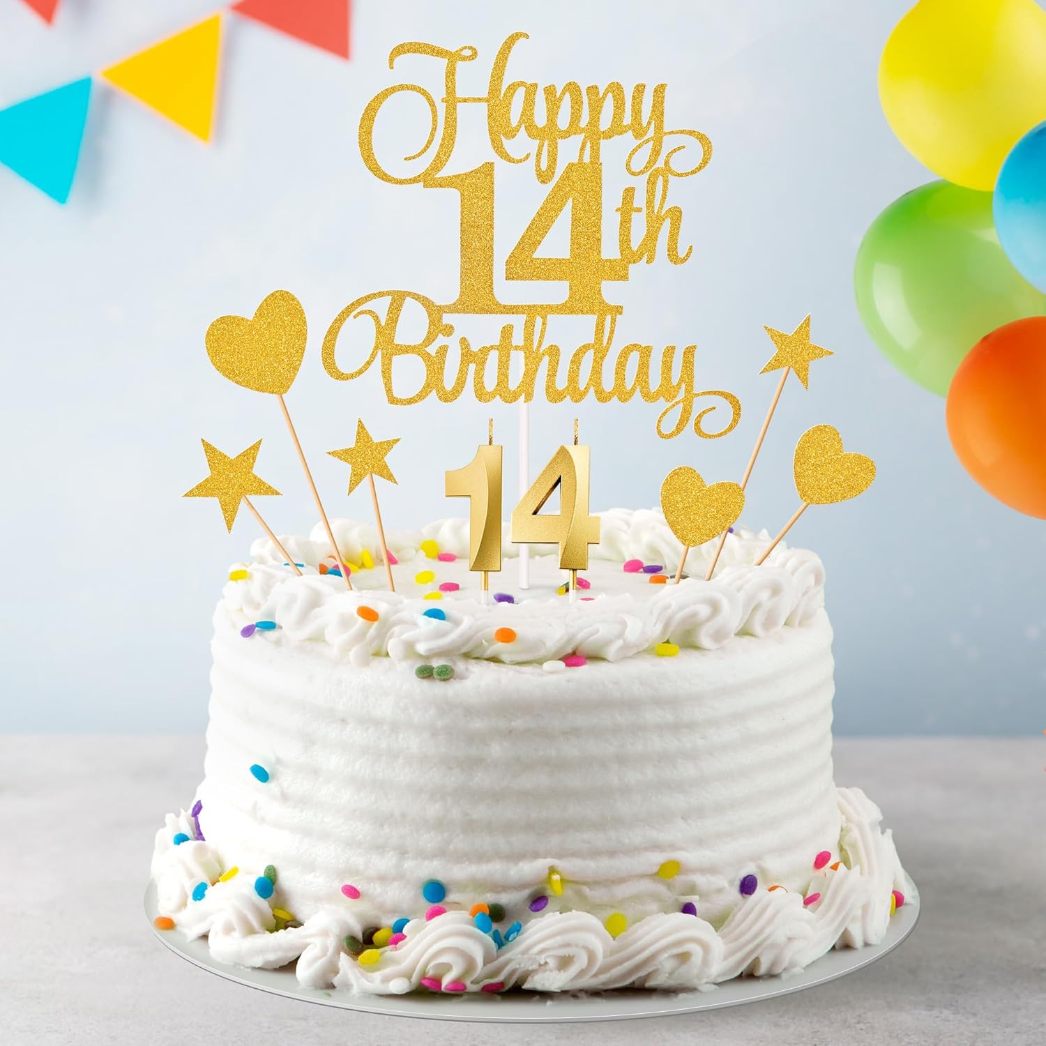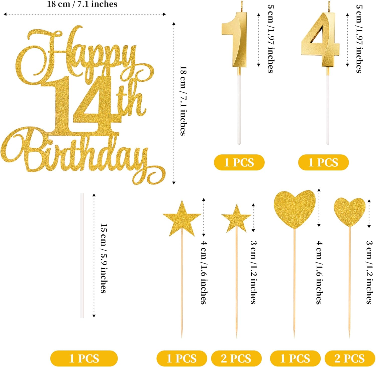 - Package content: you will receive 1 piece happy 14th birthday topper, 3 pieces star cake toppers, 3 pieces heart cake toppers and 2 pieces numeral candles, it's a great addition to the 14th birthday party and anniversary party