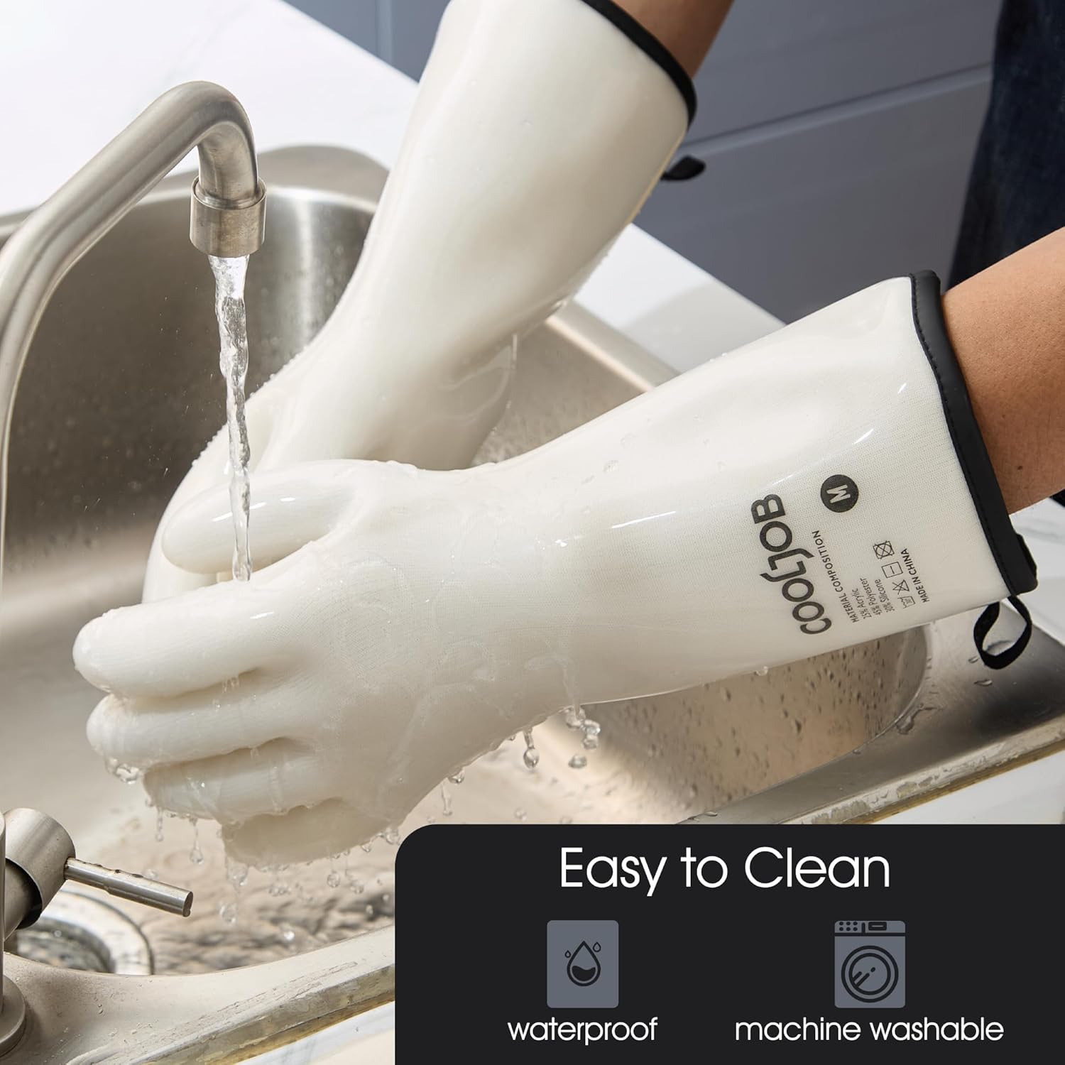 COOLJOB Heat Resistant Oven Gloves, Waterproof Liquid Silicone BBQ Grilling Gloves for Barbecue, Kitchen Cleaning, Baking, Food Contact, White, Large